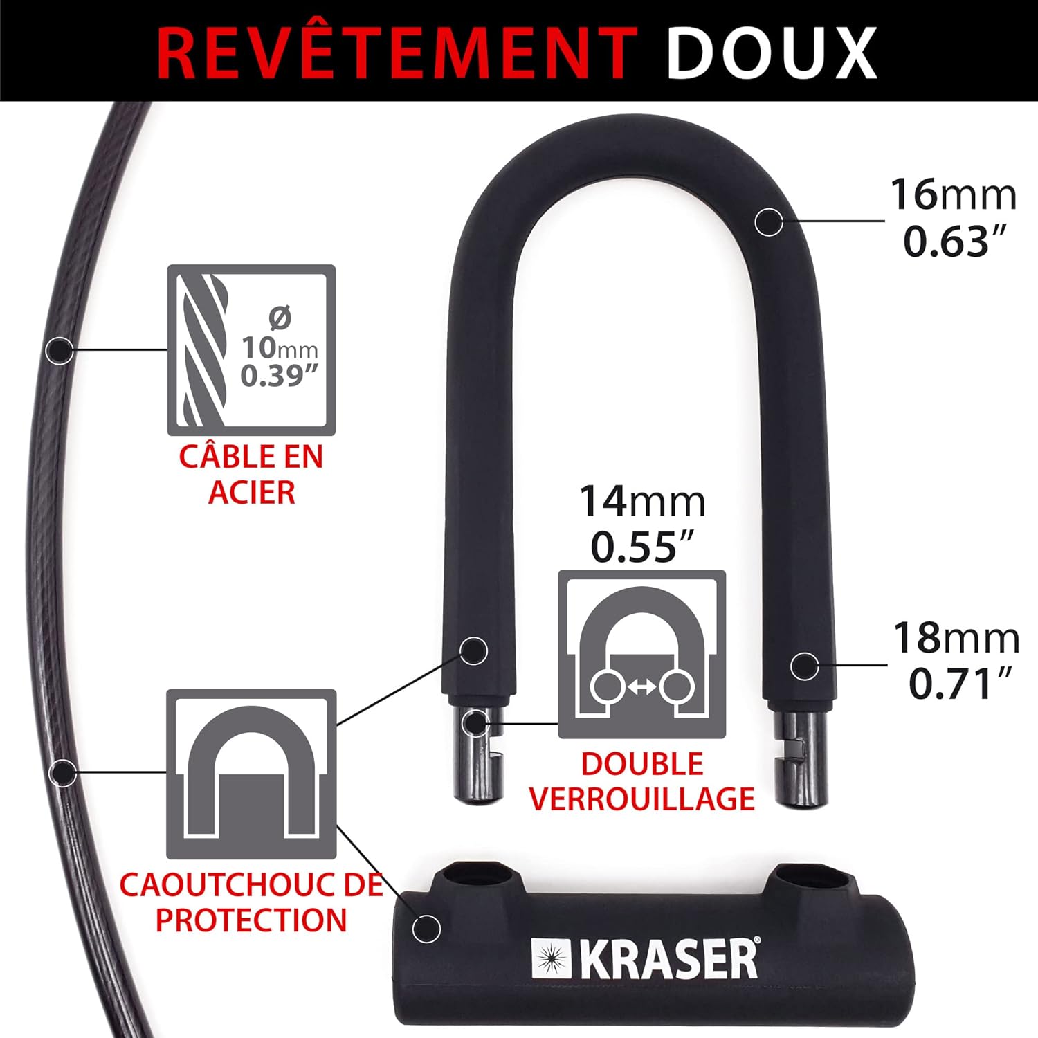 Fabriqué en acier inoxydable de haute qualité, notre antivol est conçu pour durer. Son revêtement en PVC protège contre la rouille, l’usure et les intempéries, évitant ainsi les détériorations dues à l’humidité et aux salissures.