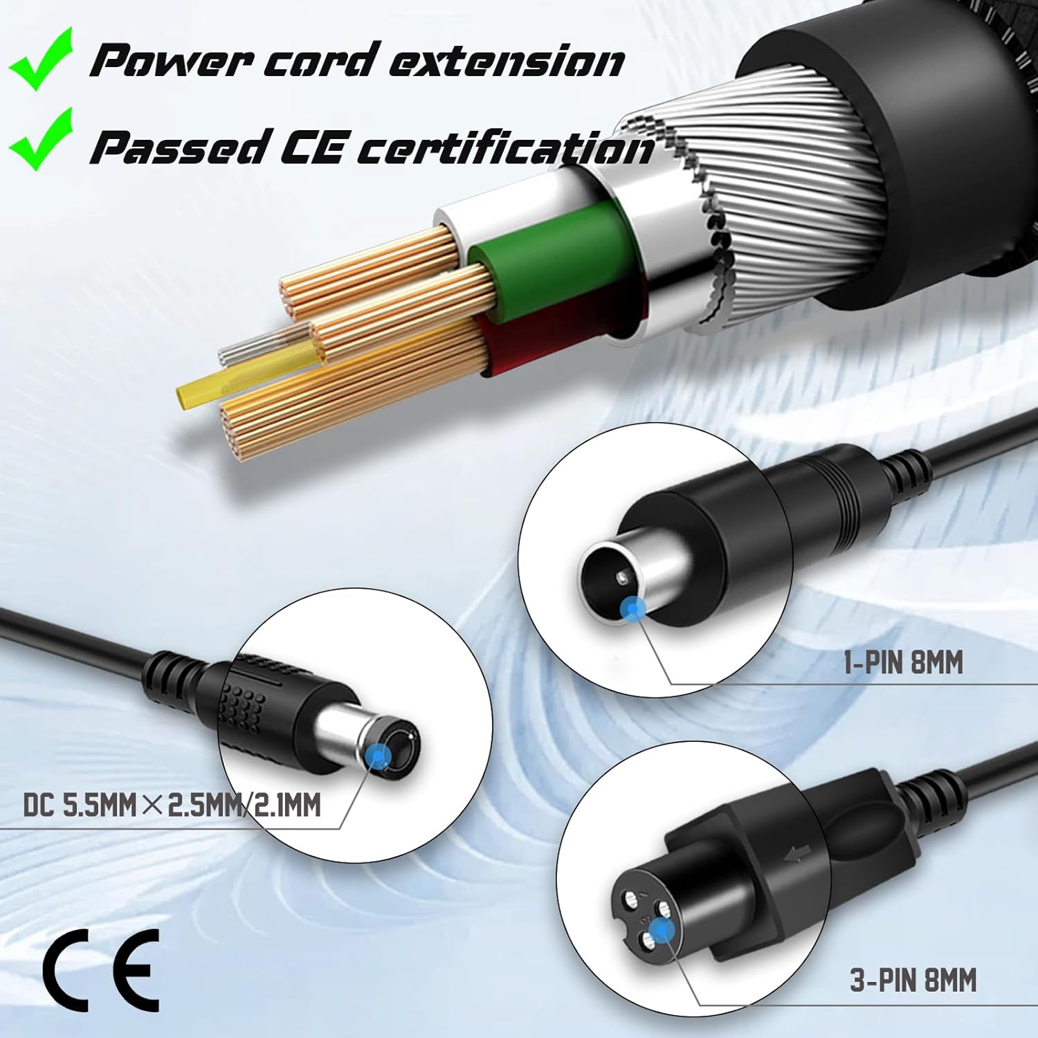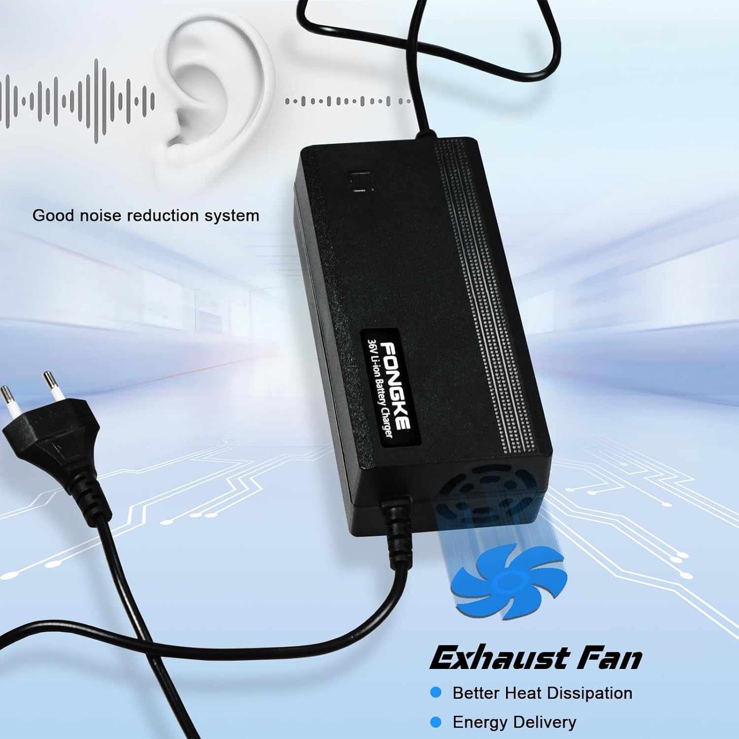 Notre chargeur est équipé de trois connecteurs interchangeables, y compris un connecteur DC 5,5×2,5mm, un connecteur à 1 broche 8mm et un connecteur à 3 broches 8mm. Il est ainsi entièrement compatible avec une large gamme d’appareils, notamment les trottinettes électriques, hoverboards, vélos électriques et autres véhicules à batterie lithium de 36V.