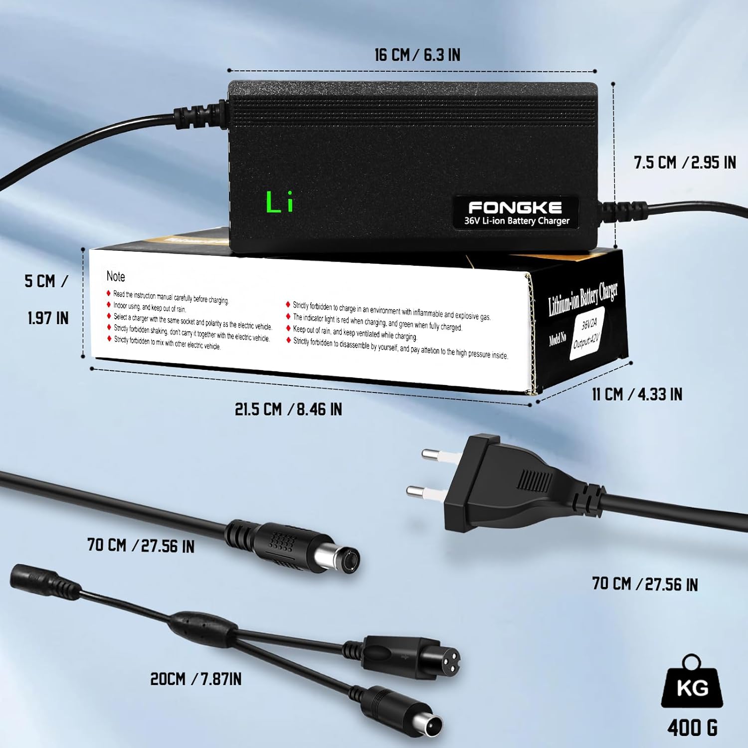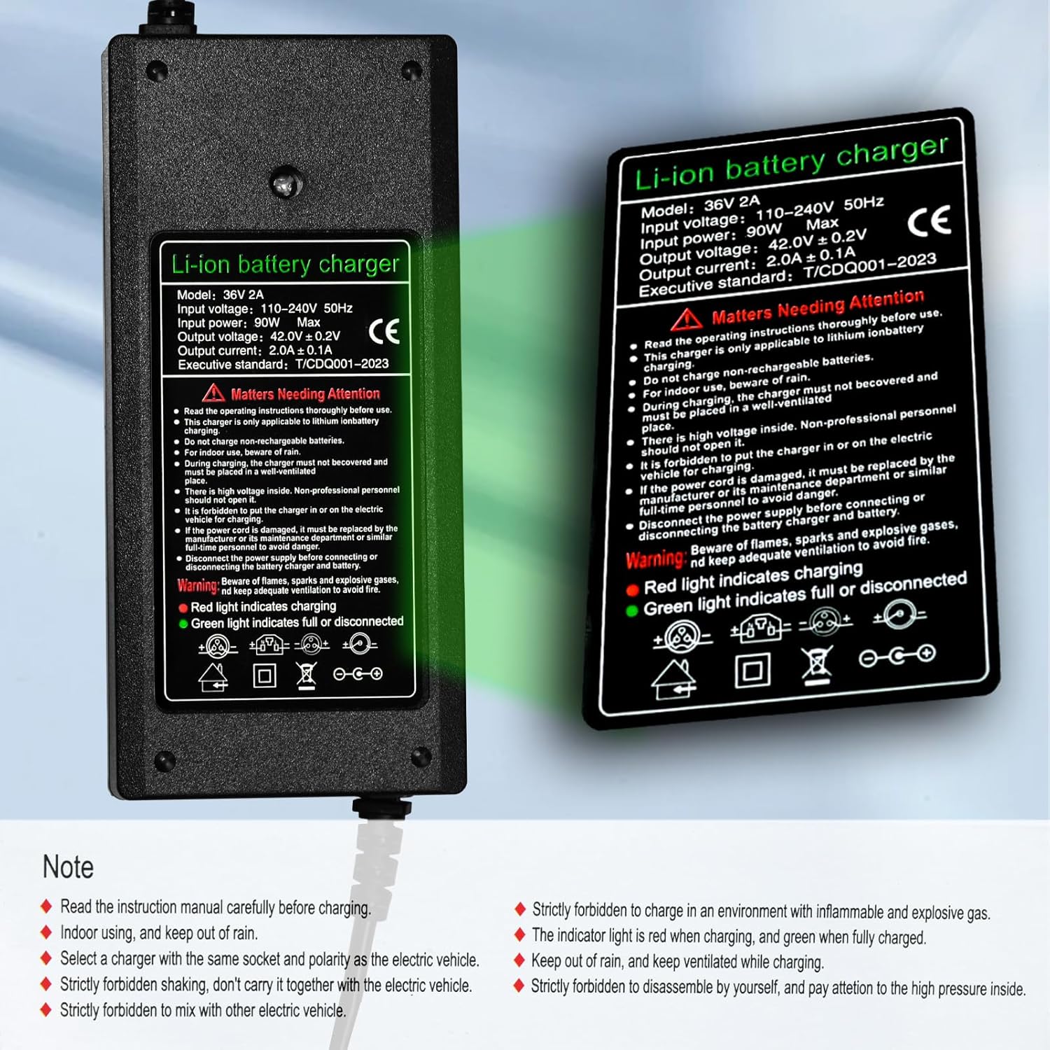 Avant d’utiliser ce chargeur, assurez-vous que votre appareil est équipé d’une batterie au lithium 36V, car il n’est pas compatible avec les batteries au plomb. Il est également important de veiller à une ventilation adéquate et de prévenir toute exposition à des flammes ou étincelles pendant le chargement pour éviter les risques d’incendie.