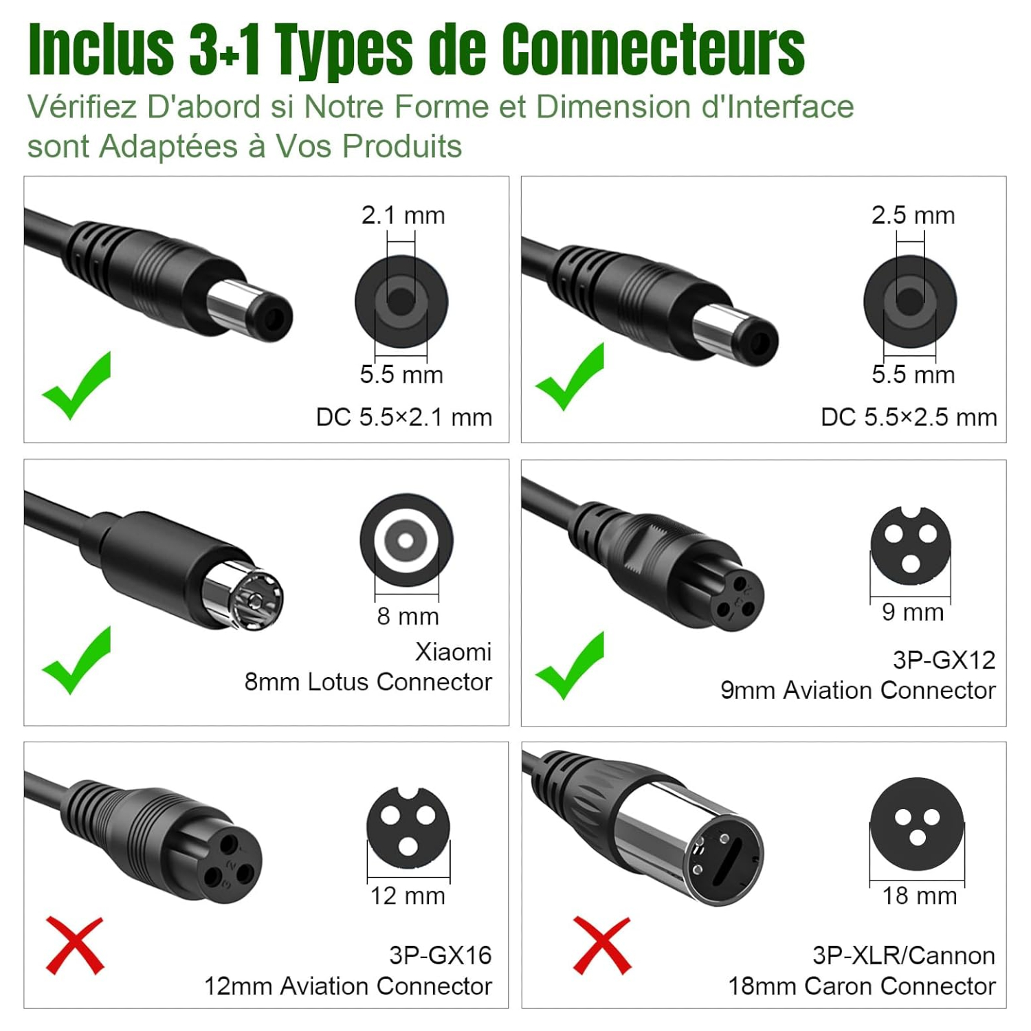 Connectique : 6 broches avec 4 adaptateurs inclus (DC5.5×2.1 mm, DC5.5×2.5 mm, aviation 9 mm, Lotus RCA 8 mm)