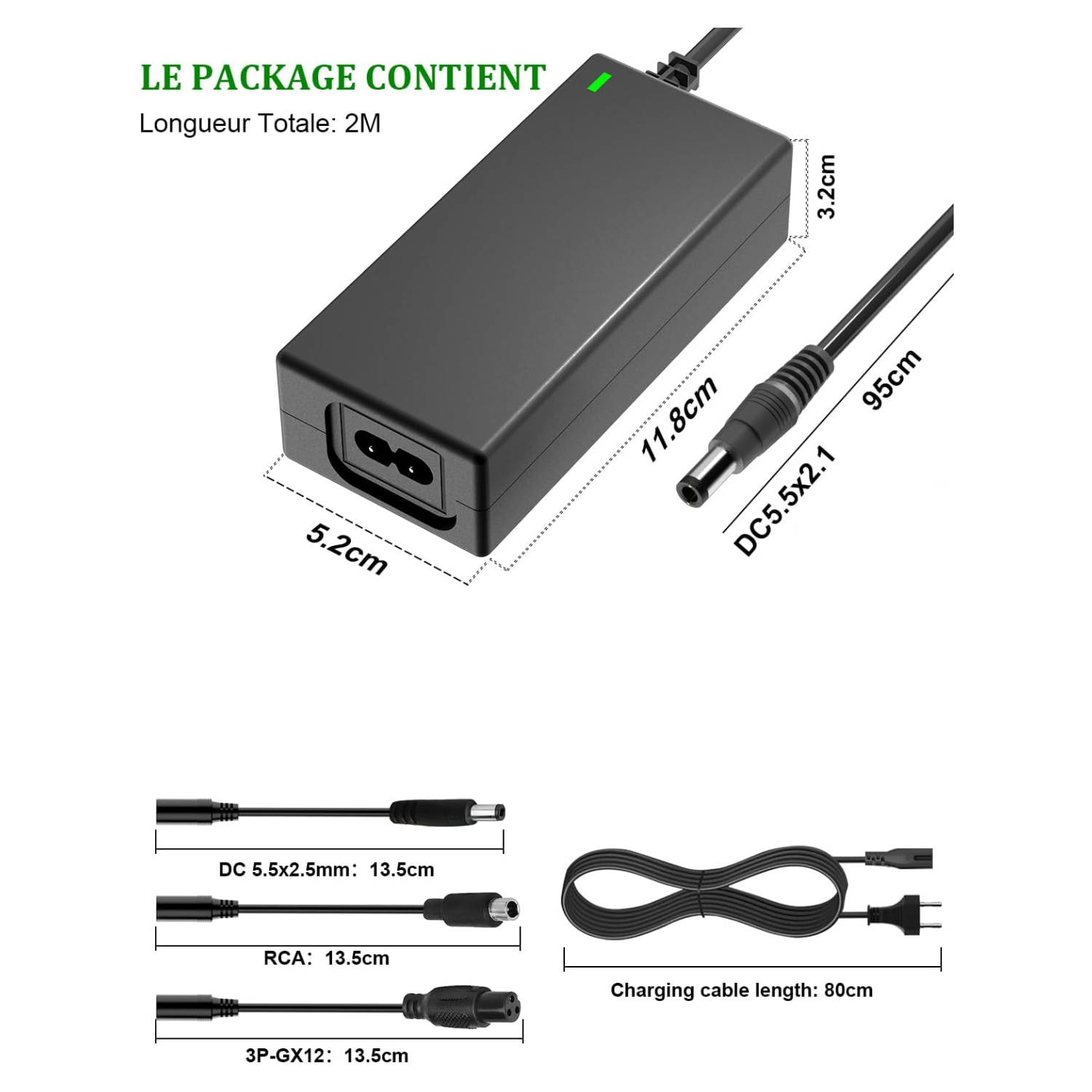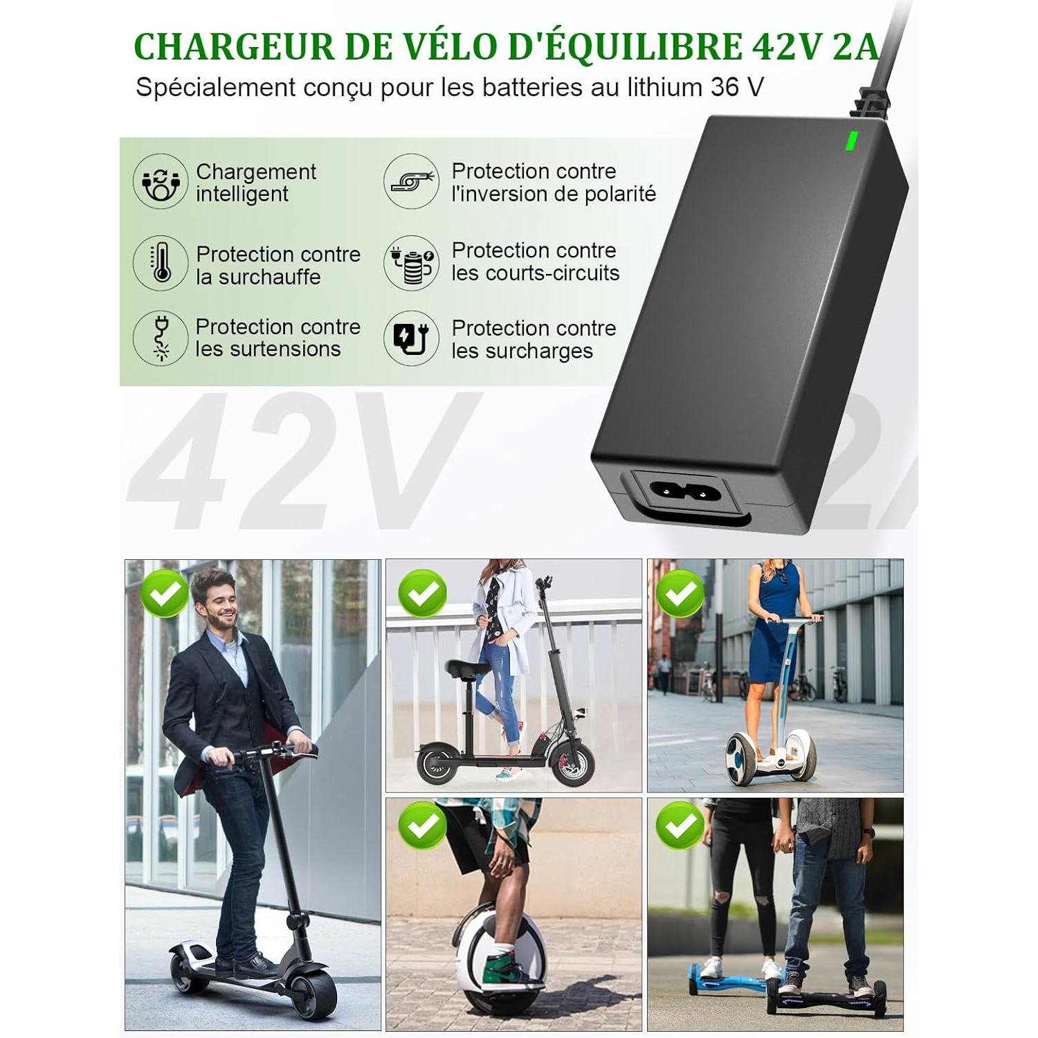Accessoires inclus : Chargeur 42V 2A avec câble de connexion et adaptateurs