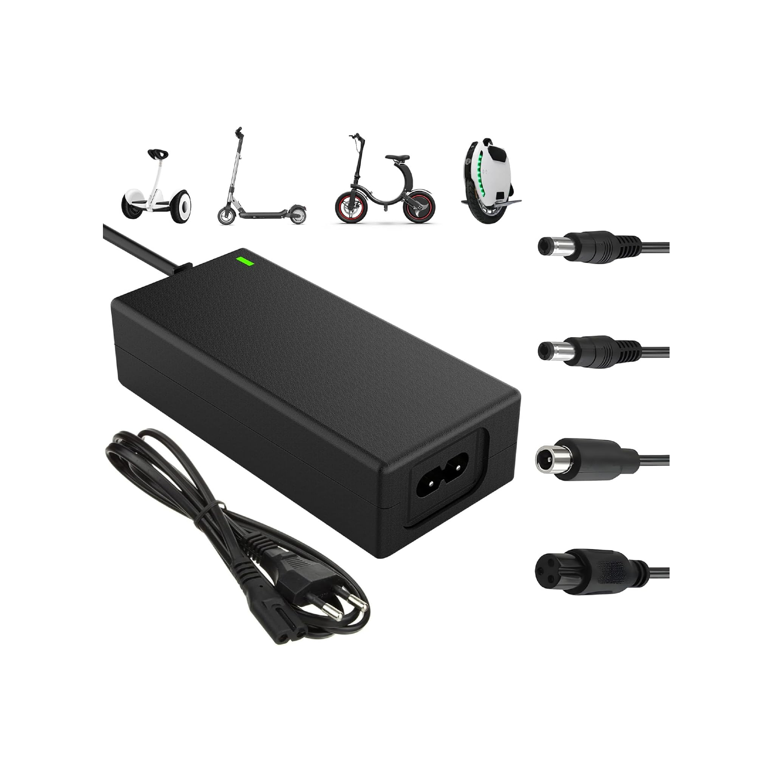Notre chargeur est conçu pour s’adapter à une large gamme de scooters électriques, hoverboards et vélos d’équilibre. Il prend en charge des modèles populaires comme Xiaomi M365, Segway Ninebot ES4, ES3, ES2, ES1 et bien d’autres. Son connecteur 6 broches et les quatre types d’adaptateurs inclus assurent une compatibilité optimale avec divers équipements.