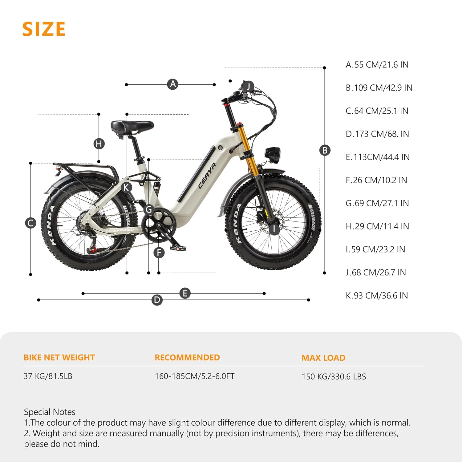 Taille de l’utilisateur recommandée : Convient aux cyclistes mesurant entre 160 cm et 195 cm.