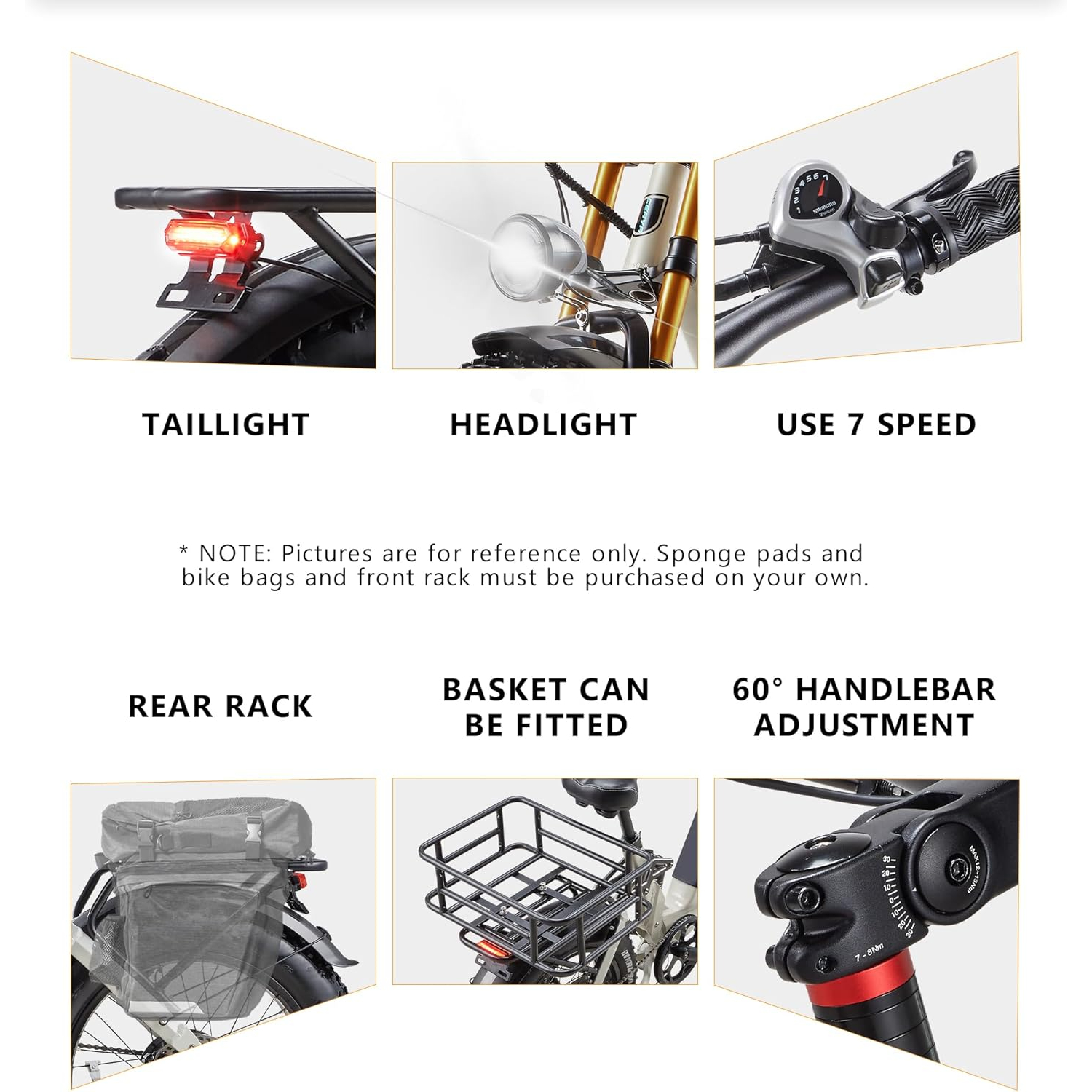 Accessoires inclus : Garde-boue, porte-bagage, klaxon, trousse d’outil, phare lumineux, feu stop arrière à LED