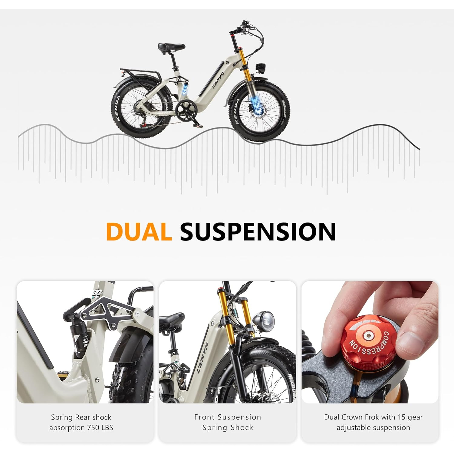 Suspension : Double suspension (fourche à double épaulement et amortisseur arrière de 750 lb)