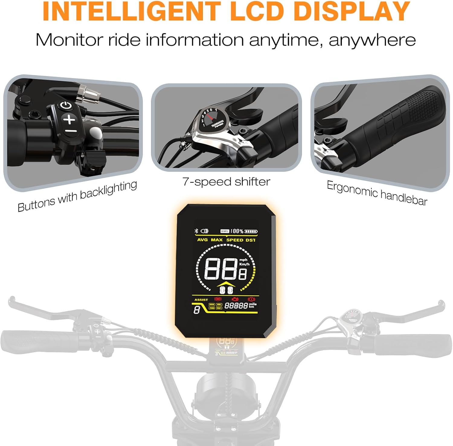 Notre cadre est adapté aux utilisateurs mesurant entre 160 cm et 190 cm, offrant une position de conduite confortable et sécurisée. Le design ergonomique assure une maniabilité optimale, que vous soyez en pleine ascension ou en descente. Un écran HD intelligent est intégré, affichant clairement la vitesse, le niveau de batterie et la distance parcourue. Il inclut également une fonction de diagnostic rapide des pannes via des codes d’erreur. Les boutons rétroéclairés de l’écran garantissent une visibilité parfaite, même dans des conditions de faible luminosité, permettant une utilisation intuitive du vélo à assistance électrique.