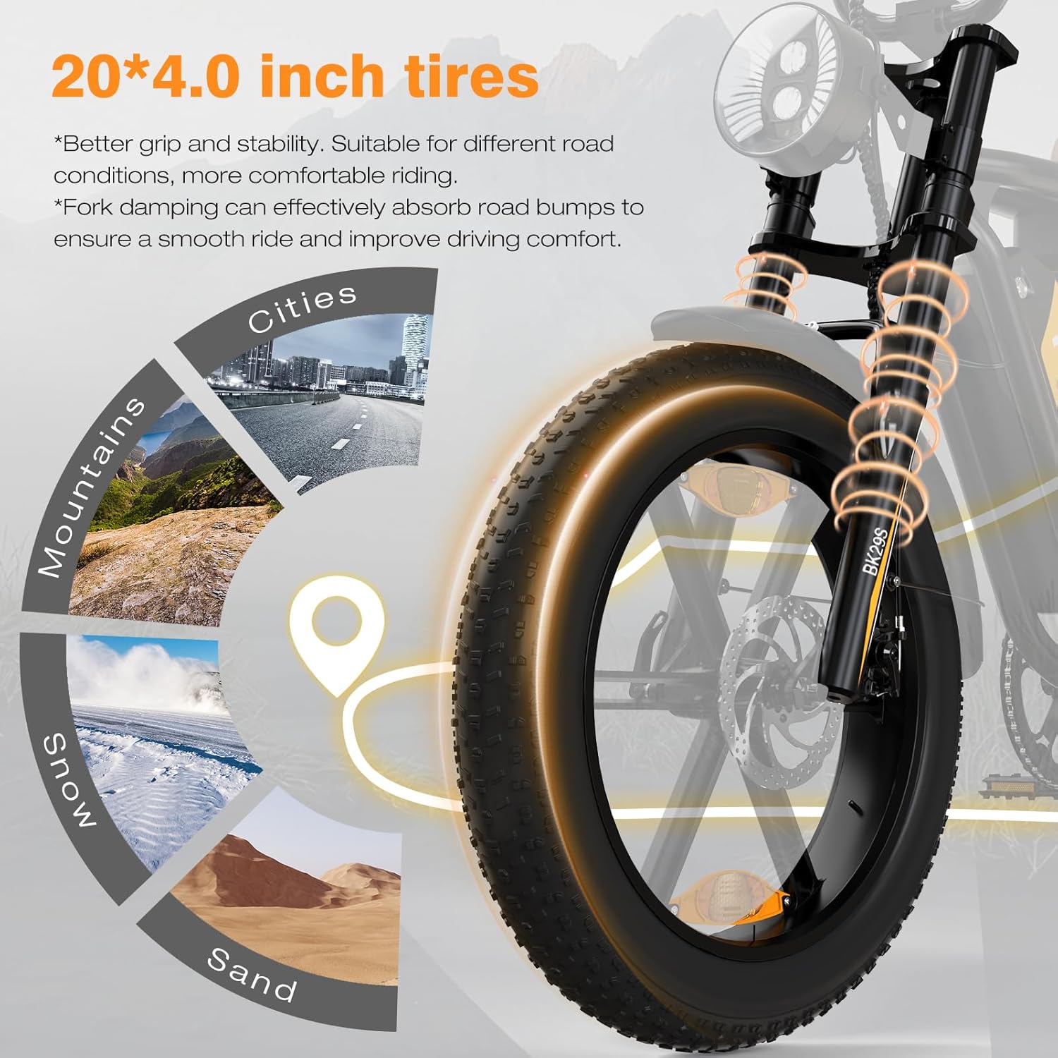 Le confort est une priorité pour notre Fat Bike Électrique 24 Pouces. La fourche avant à suspension absorbe efficacement les chocs et les vibrations de la route, réduisant la fatigue sur les longs trajets. La selle, large et ergonomique, est équipée d’un coussin en mousse à mémoire de forme, offrant une assise souple et un soutien optimal. Cette combinaison de suspension avant et de selle confortable garantit une expérience de conduite agréable, même sur les terrains les plus accidentés. Les gros pneus de 20×4,0 pouces, résistants aux crevaisons et à l’abrasion, contribuent également à l’amortissement des chocs, assurant une excellente adhérence et une stabilité remarquable.