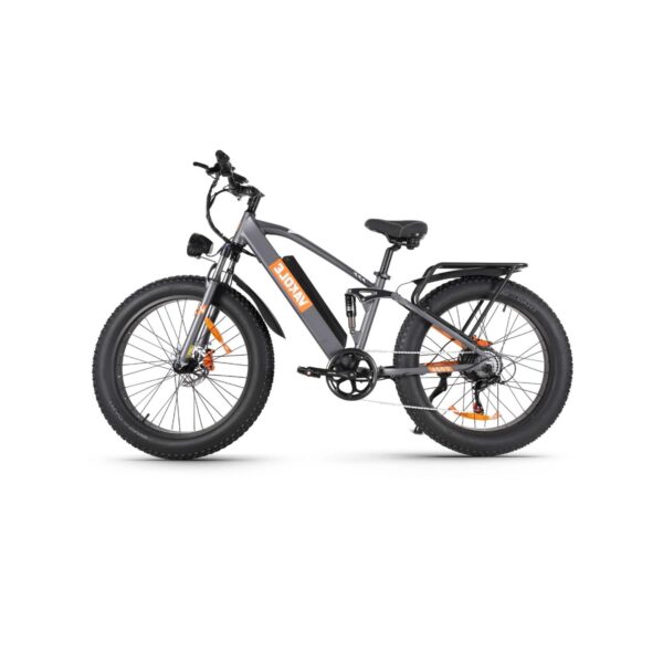 Le fat bike électrique à double suspension est doté d’une fourche avant verrouillable et d’un amortisseur arrière de 1000LBS, assurant une absorption efficace des chocs sur terrains accidentés. Ce système améliore la traction et le confort du cycliste, même à grande vitesse ou sur longues distances.