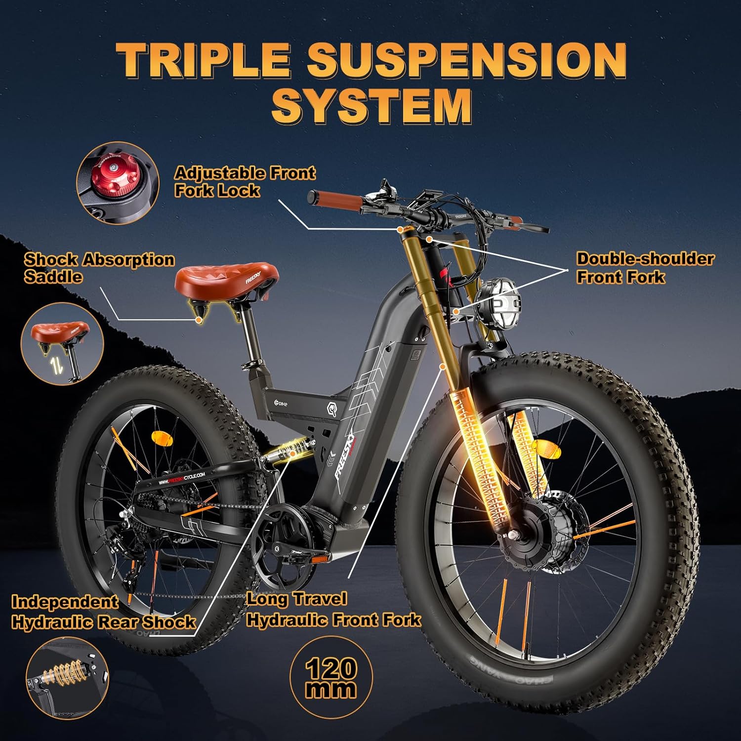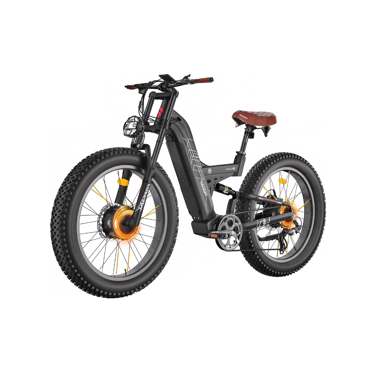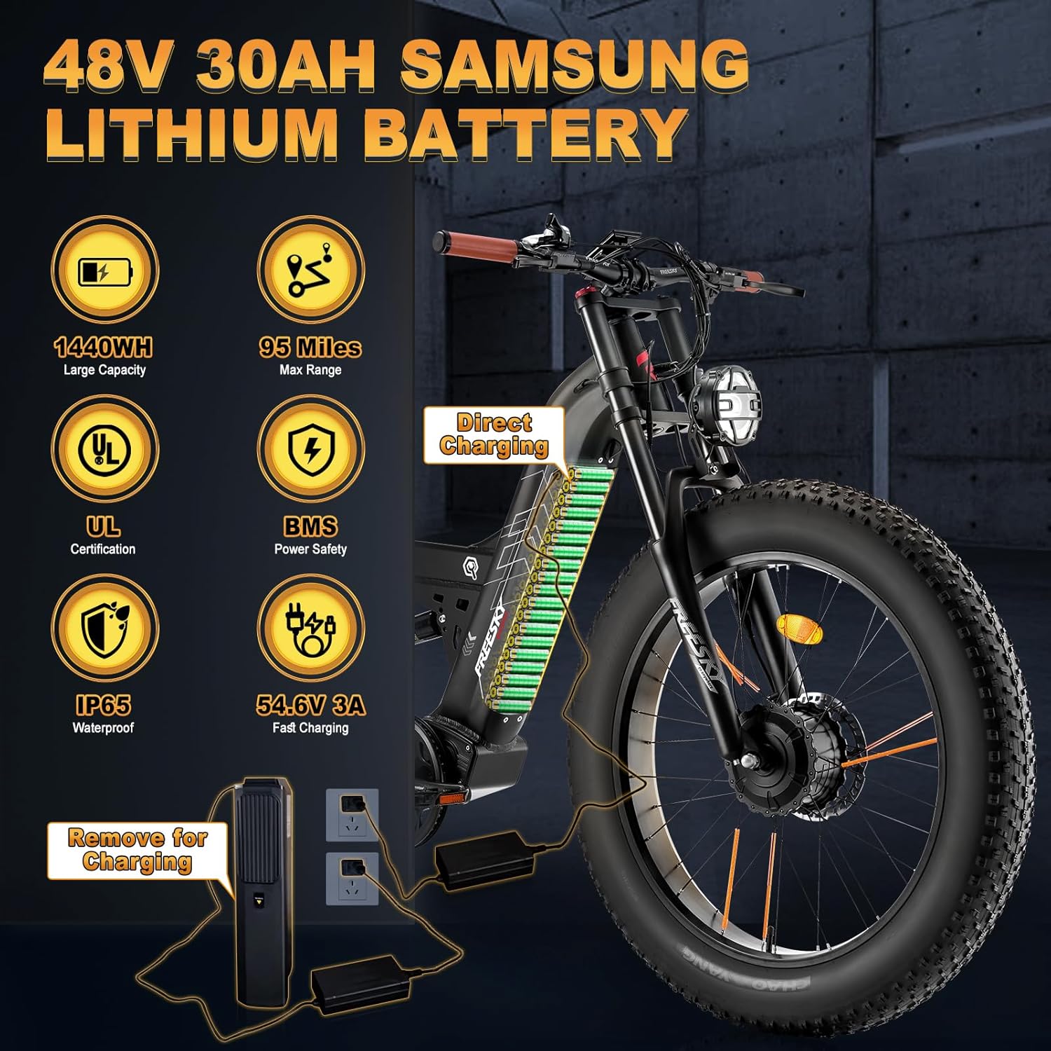 Équipé d’une batterie lithium-ion amovible de 48V 30Ah, notre cycle à pneus larges assisté électriquement propose une autonomie impressionnante, pouvant atteindre 150 km en mode mono-moteur ou 90 km en mode double-moteur. Cette capacité vous assure de longues heures de plaisir sans souci de recharge fréquente. La batterie est également amovible, offrant une flexibilité accrue pour la recharge à domicile ou au bureau, et ne nécessite que 8 à 10 heures pour une charge complète grâce au chargeur rapide fourni.