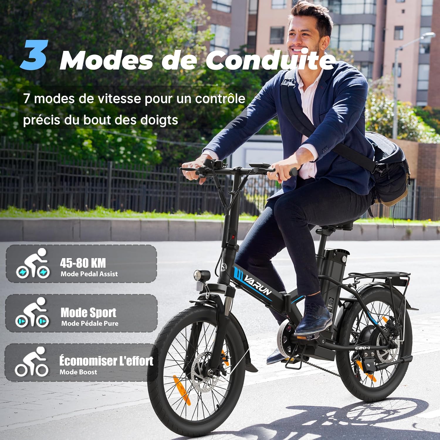 Notre Mini Vélo Électrique Pliable Léger se distingue par ses 7 vitesses et ses 3 modes de conduite, vous permettant de moduler votre effort et votre vitesse selon le terrain et vos préférences. Que ce soit pour une balade tranquille en ville ou une exploration plus dynamique, vous bénéficiez d’une flexibilité optimale. Le système de fourche absorbant les chocs assure une conduite souple même sur les routes irrégulières, et les freins à double disque garantissent un freinage réactif et sécurisé.
