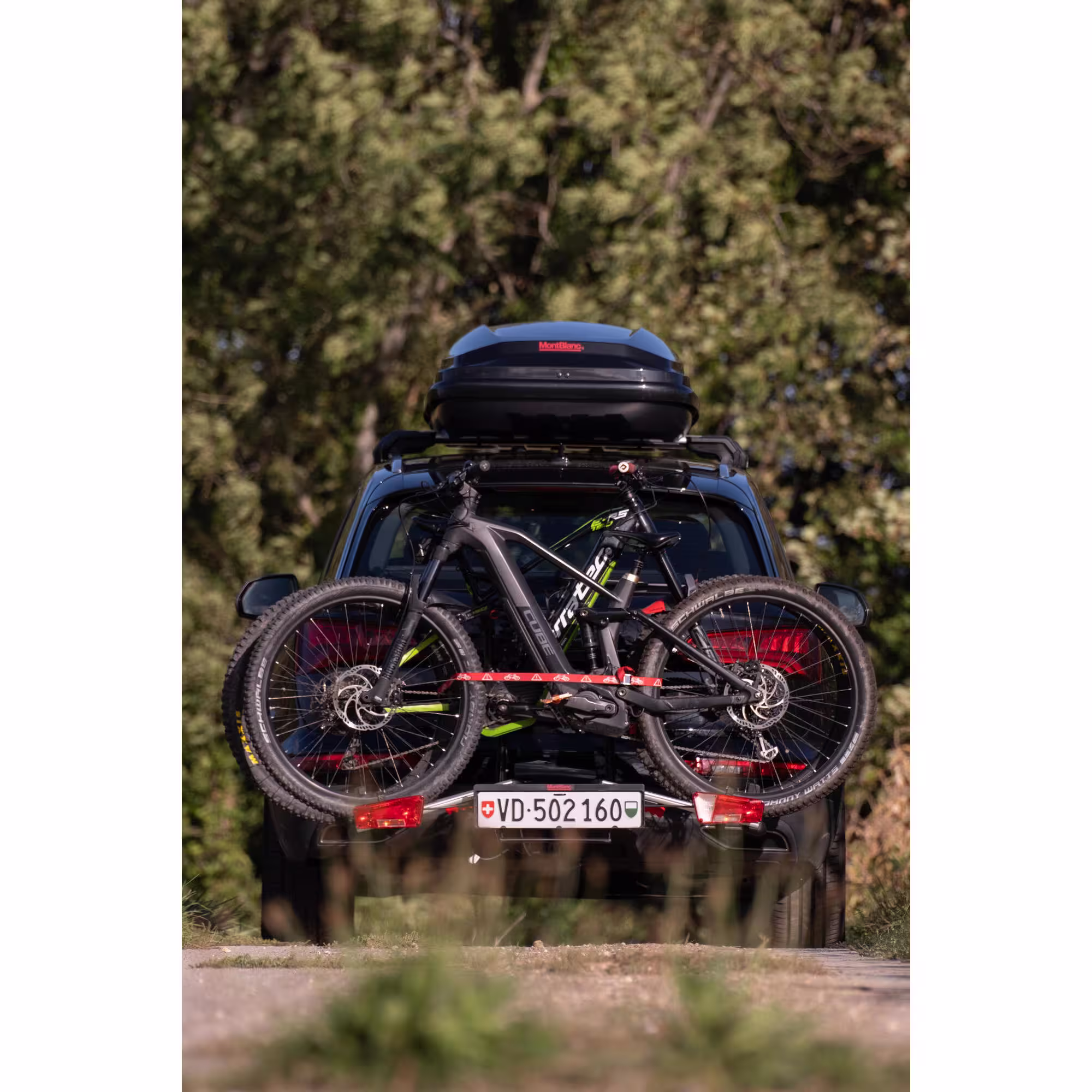 Notre porte vélos pour VAE est équipé des systèmes Easygo et Readyfit. Easygo permet un montage rapide sans outil, tandis que Readyfit assure que le porte-vélos est livré entièrement assemblé, prêt à l’usage dès sa sortie de la boîte. Le mécanisme de basculement permet un accès direct au coffre sans retirer les vélos.