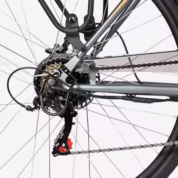 Le VAE 29 pouces urbain intègre une transmission Shimano 6 vitesses et des freins à disque mécaniques, offrant un contrôle précis et une sécurité optimale lors de vos trajets en ville ou sur routes légèrement accidentées.
