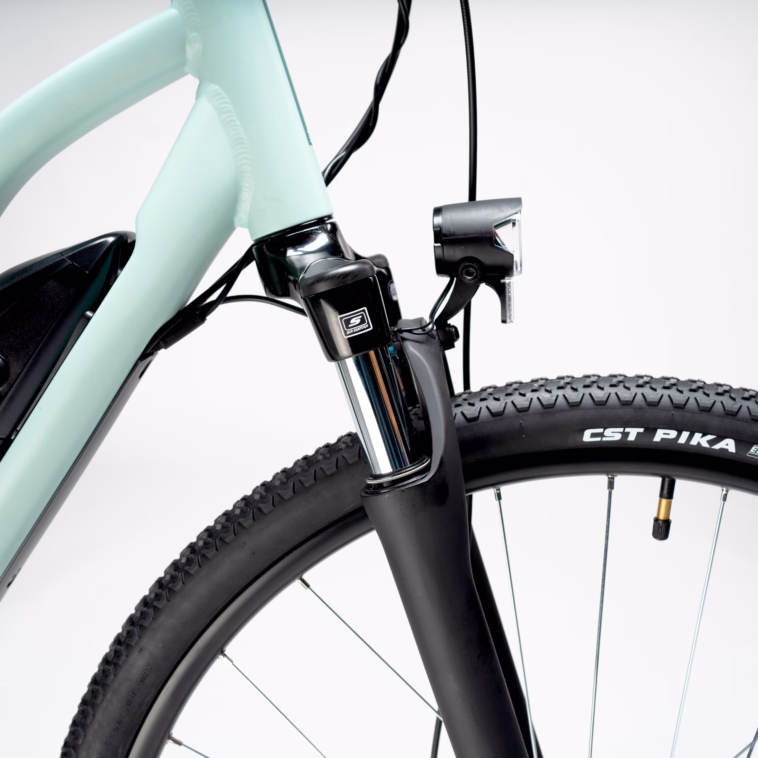 Notre VAE VTC est équipé de roues de 28 pouces à double paroi en aluminium, résistantes et polyvalentes, conçues pour affronter sereinement les routes et les chemins. Pour optimiser le confort et la tranquillité d’esprit, nous avons sélectionné des pneus tout chemin renforcés anti-crevaison « CST PIKA » et des chambres à air auto-obturantes, minimisant ainsi les risques de crevaison et la perte de pression. La fourche suspendue et ajustable, avec un débattement de 63 mm, contribue également à une absorption efficace des chocs, rendant chaque sortie agréable. Le blocage rapide de la roue avant facilite le transport de votre moyen de locomotion électrique, et l’éclairage intégré, alimenté par la batterie, assure votre visibilité et votre sécurité, de jour comme de nuit.