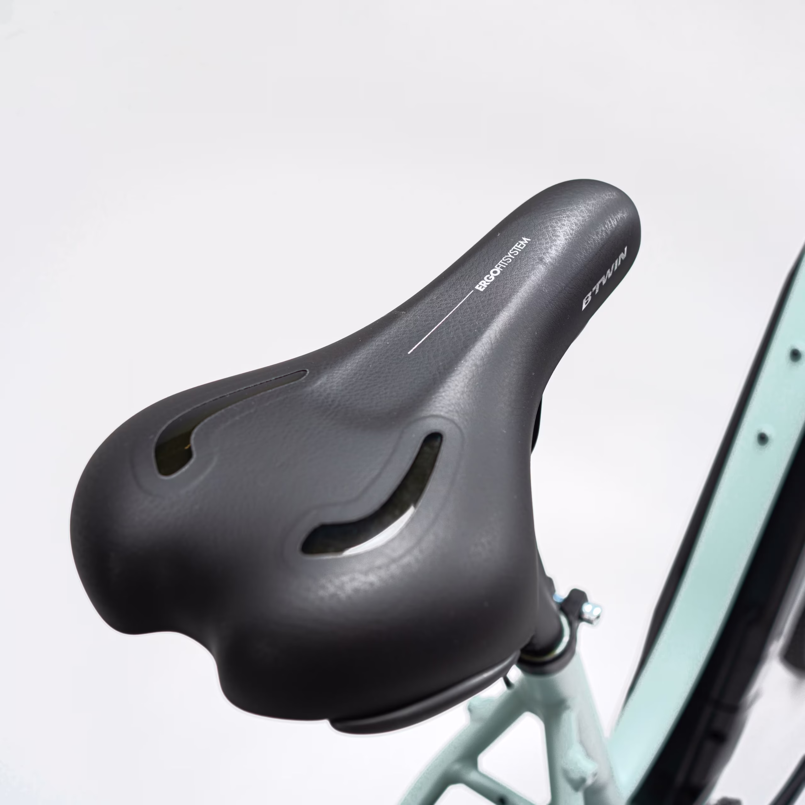 Le cadre de ce vélo à assistance électrique a été minutieusement élaboré en aluminium 6061, garantissant légèreté et robustesse. Sa géométrie abaissée facilite grandement l’enjambement, offrant un confort optimal pour tous les utilisateurs. La position de conduite est légèrement relevée, associée à une selle trekking GEL exclusive et une tige de selle en aluminium réglable sans outil, pour une assise confortable même sur de longues distances. La fourche suspendue Suntour avec un débattement de 63 mm absorbe efficacement les irrégularités du terrain, assurant une expérience de conduite douce et agréable. Des inserts sont prévus pour vous permettre d’accessoiriser aisément votre monture avec un porte-bidon ou un porte-bagage.