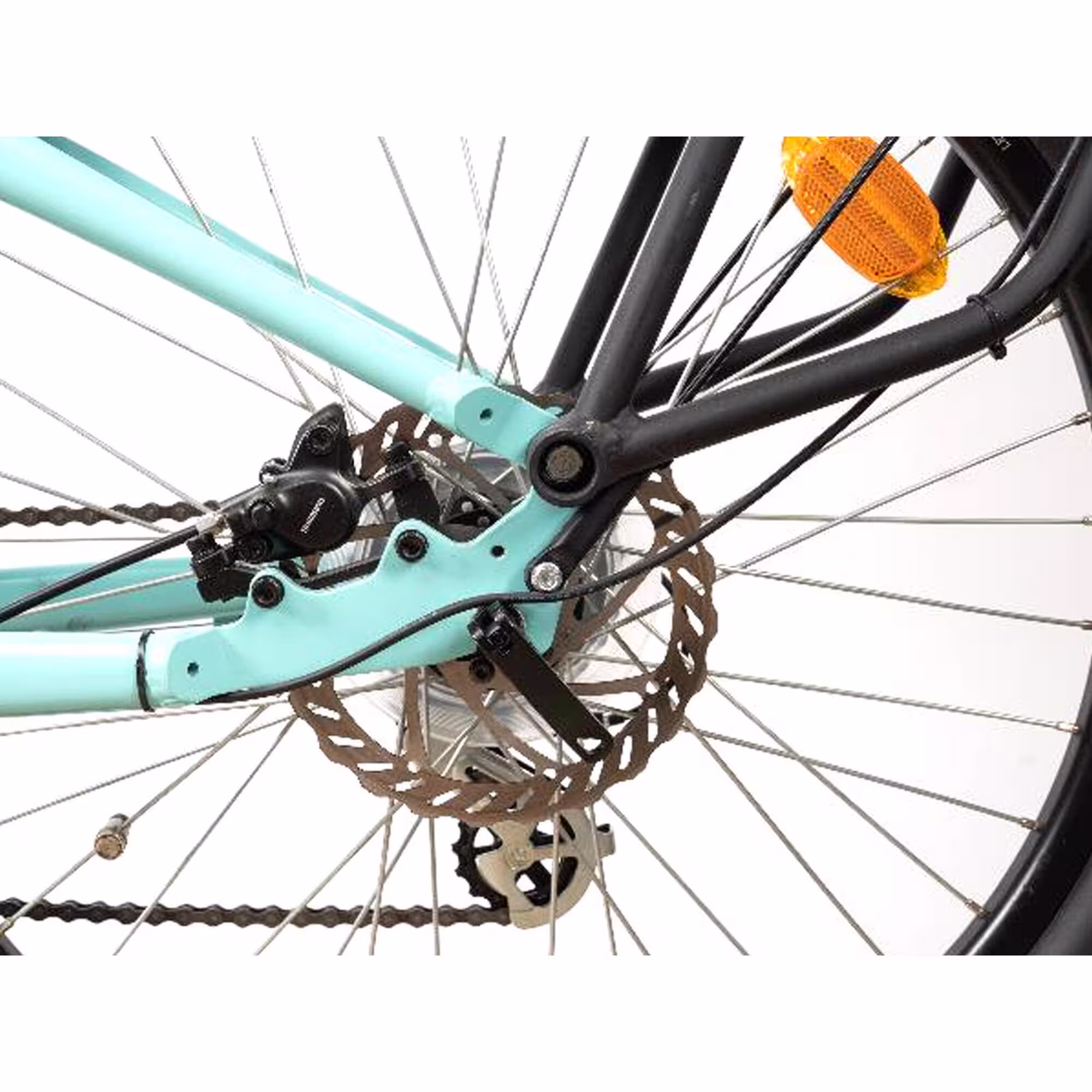 Les freins à disque hydrauliques assurent un freinage efficace et sécurisé en toutes circonstances, offrant un contrôle précis du vélo. La présence d’une béquille et de garde-boue ajoute au confort d’utilisation au quotidien. L’éclairage est alimenté par la batterie, garantissant une visibilité optimale, tandis que la sonnette intégrée permet de signaler votre présence.