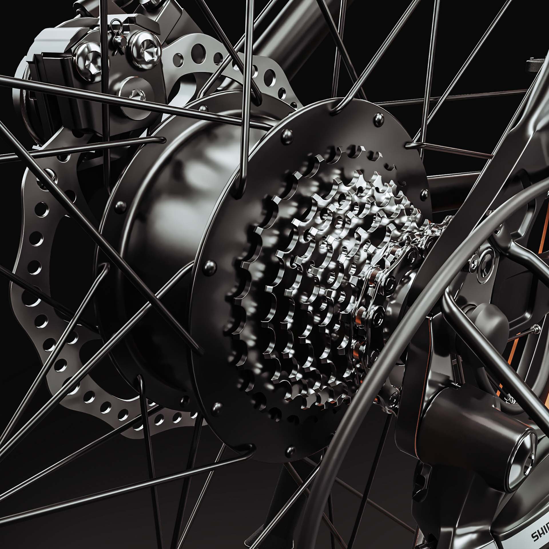 La transmission électrique 7 vitesses Shimano garantit un passage de vitesses fluide et fiable. Couplée au moteur Bafang, elle assure une propulsion efficace et adaptée à tous les types de parcours, simplifiant la conduite sur route et sur chemins légers.