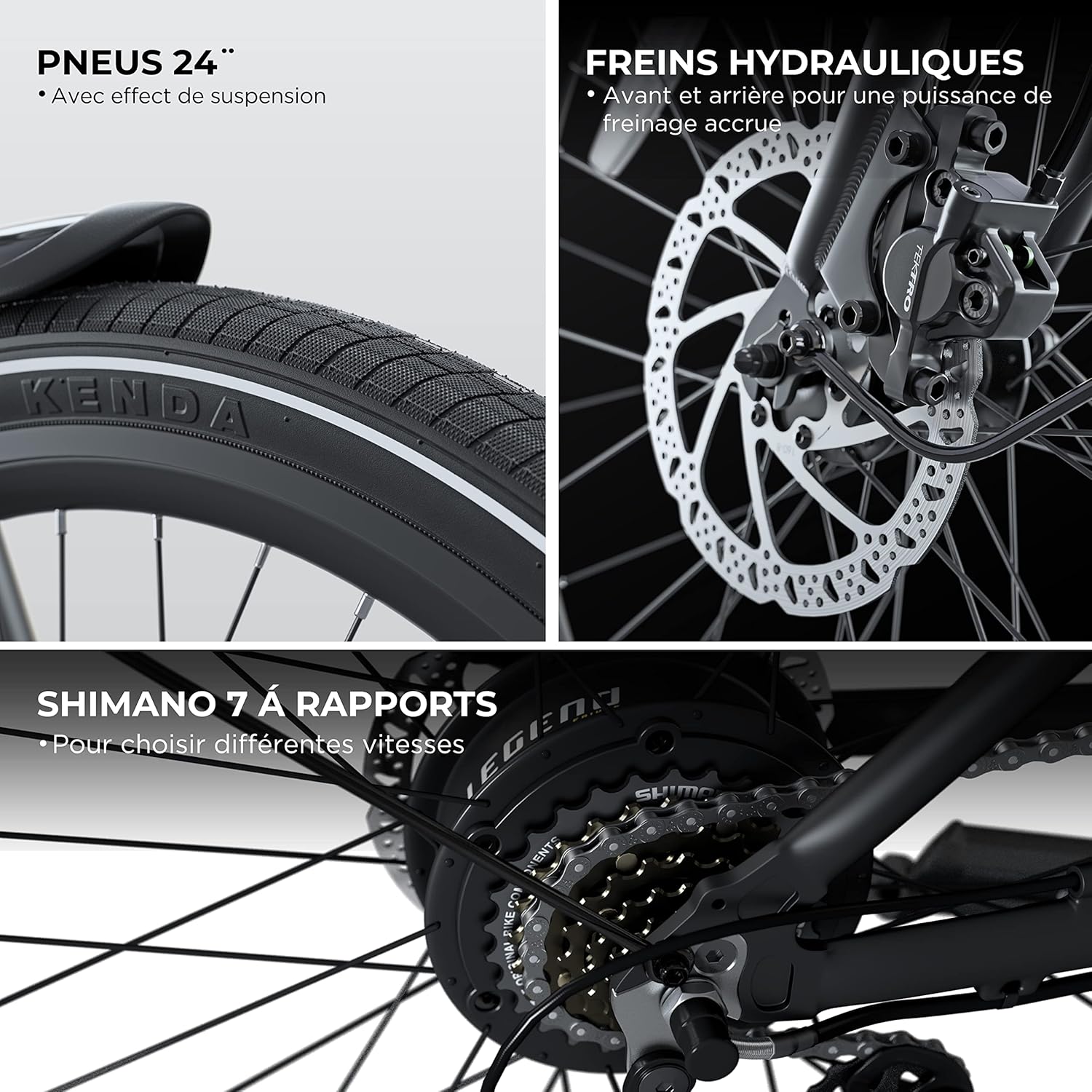 Ce vélo urbain électrifié avec jantes 24’’ est équipé de freins à disque hydrauliques offrant un freinage précis et progressif, même en cas de pluie. Son dérailleur Shimano 7 vitesses assure une adaptation optimale à chaque situation, tandis que la selle en gel et le guidon ergonomique augmentent votre confort sur de longues distances.