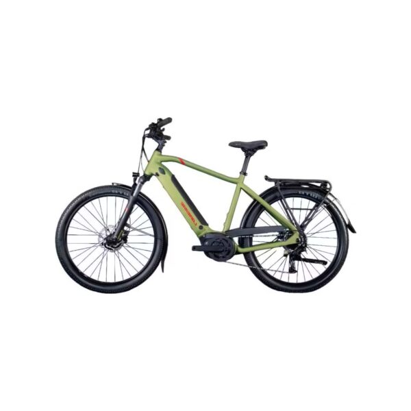 Ce vélo électrique avec transmission 9 vitesses est livré avec un équipement complet : garde-boues, porte-bagages MIK Ready 25 kg, et éclairage avant Spanninga Axendo 30 Lux associé à un feu arrière AXA Juno. Ces éléments assurent visibilité et sécurité pour une utilisation urbaine ou de loisir.