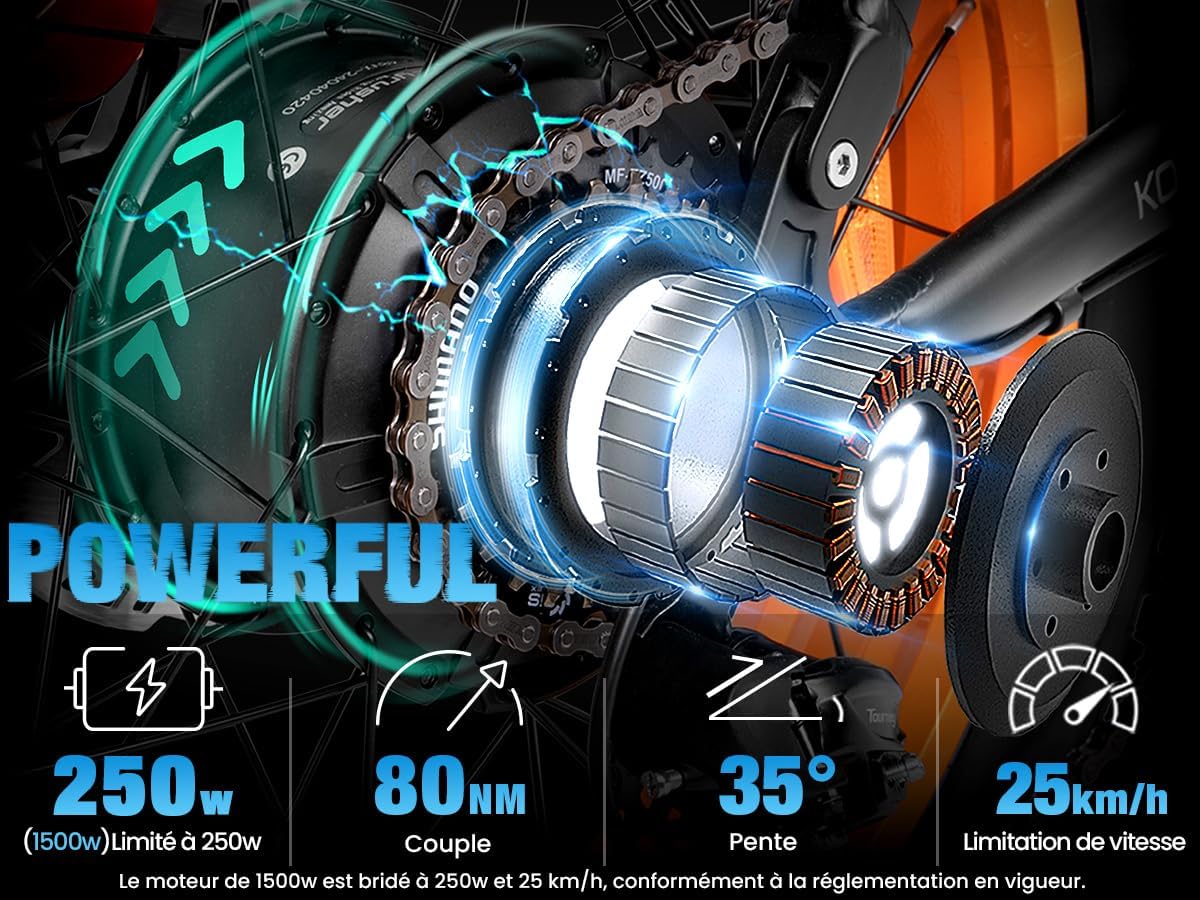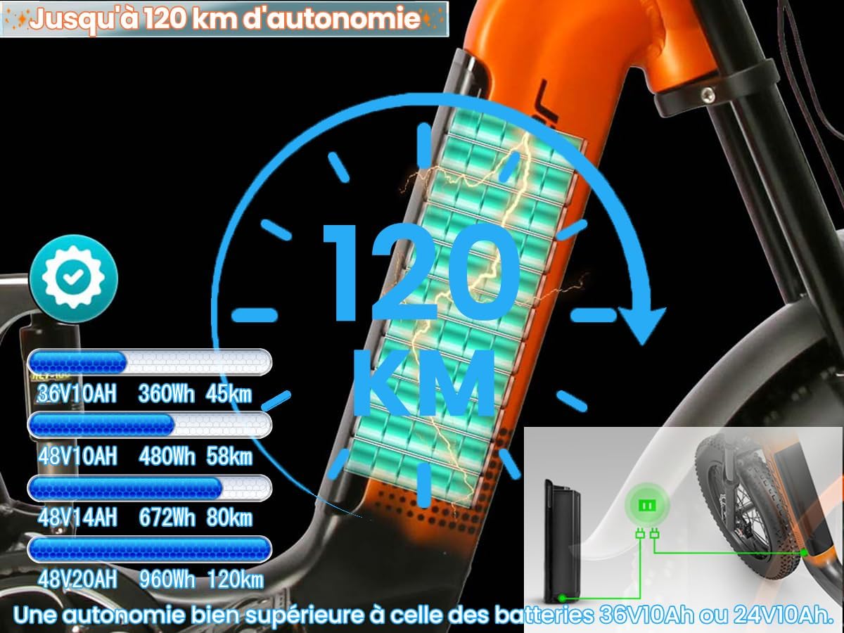 • Autonomie  : Jusqu’à 120 km en mode assistance au pédalage, avec une batterie lithium 48V 20Ah 960Wh
