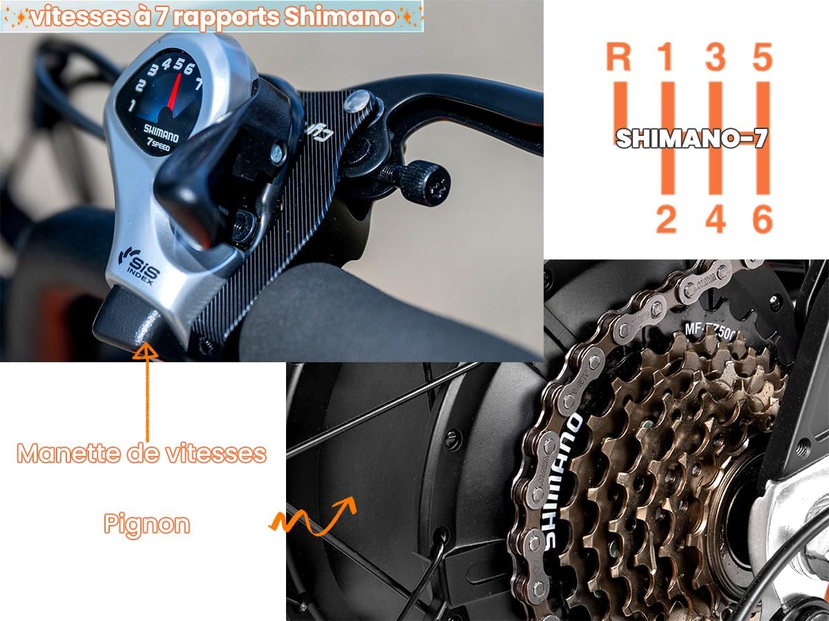 Pour votre sécurité, notre vélo est doté de freins à disque hydrauliques avant et arrière, offrant une puissance de freinage exceptionnelle et un contrôle précis, même dans des conditions météorologiques difficiles. Les leviers de frein antidérapants intègrent un interrupteur de coupure du moteur pour une réactivité accrue. Le système de changement de vitesse à 7 vitesses assure une transition fluide entre les rapports, vous permettant d’adapter votre allure à chaque situation.