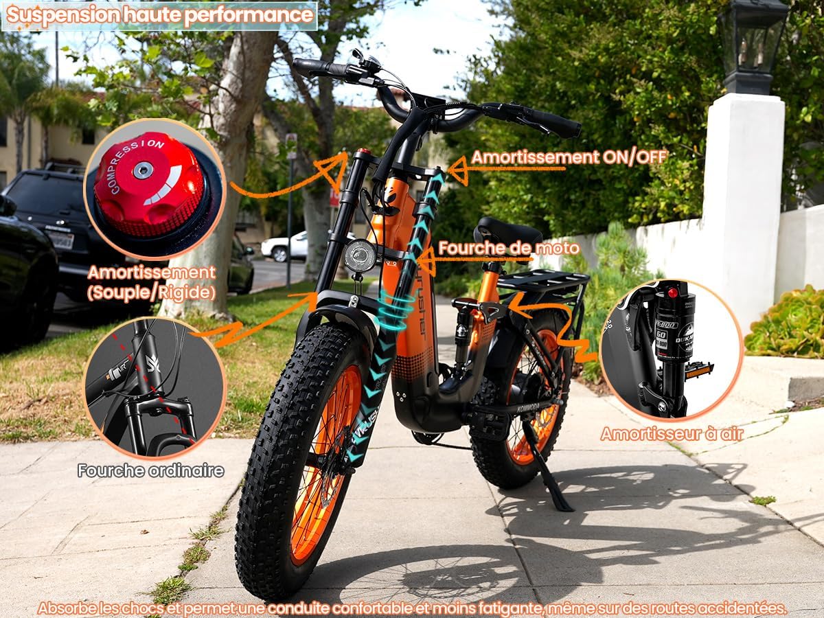 Ce vélo est équipé d’une fourche avant de type moto à débattement long et réglable, associée à un amortisseur central à air ajustable, offrant une absorption des chocs supérieure et un confort de conduite optimal. Les pneus de 20 pouces de large, anti-crevaison, garantissent une adhérence exceptionnelle sur une multitude de surfaces, qu’il s’agisse de gravier, de neige, de sable mou ou de boue.