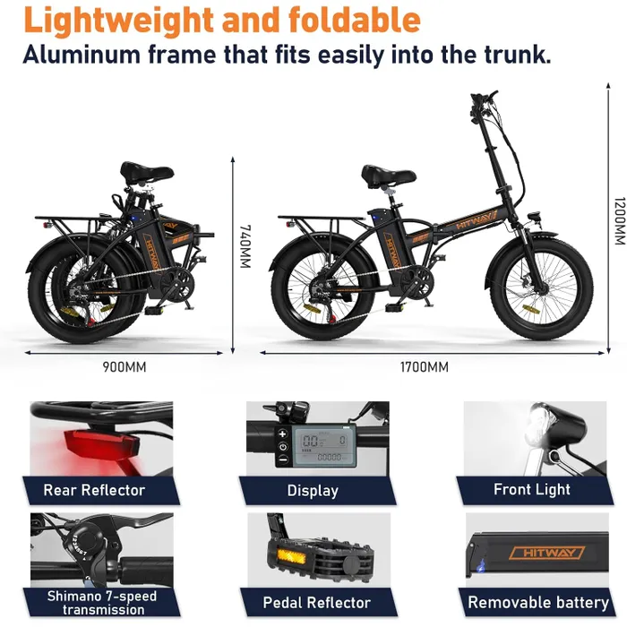 Notre Vélo Électrique Amovible est construit avec un cadre en alliage d’aluminium, ce qui lui confère une légèreté remarquable, avec un poids de seulement 25,8 kg. Sa conception pliante permet de réduire ses dimensions à 900 mm x 500 mm x 740 mm une fois replié. Cette caractéristique le rend facile à transporter et à ranger, pouvant aisément s’insérer dans un coffre de voiture, optimisant ainsi l’espace disponible et vous offrant une flexibilité précieuse.