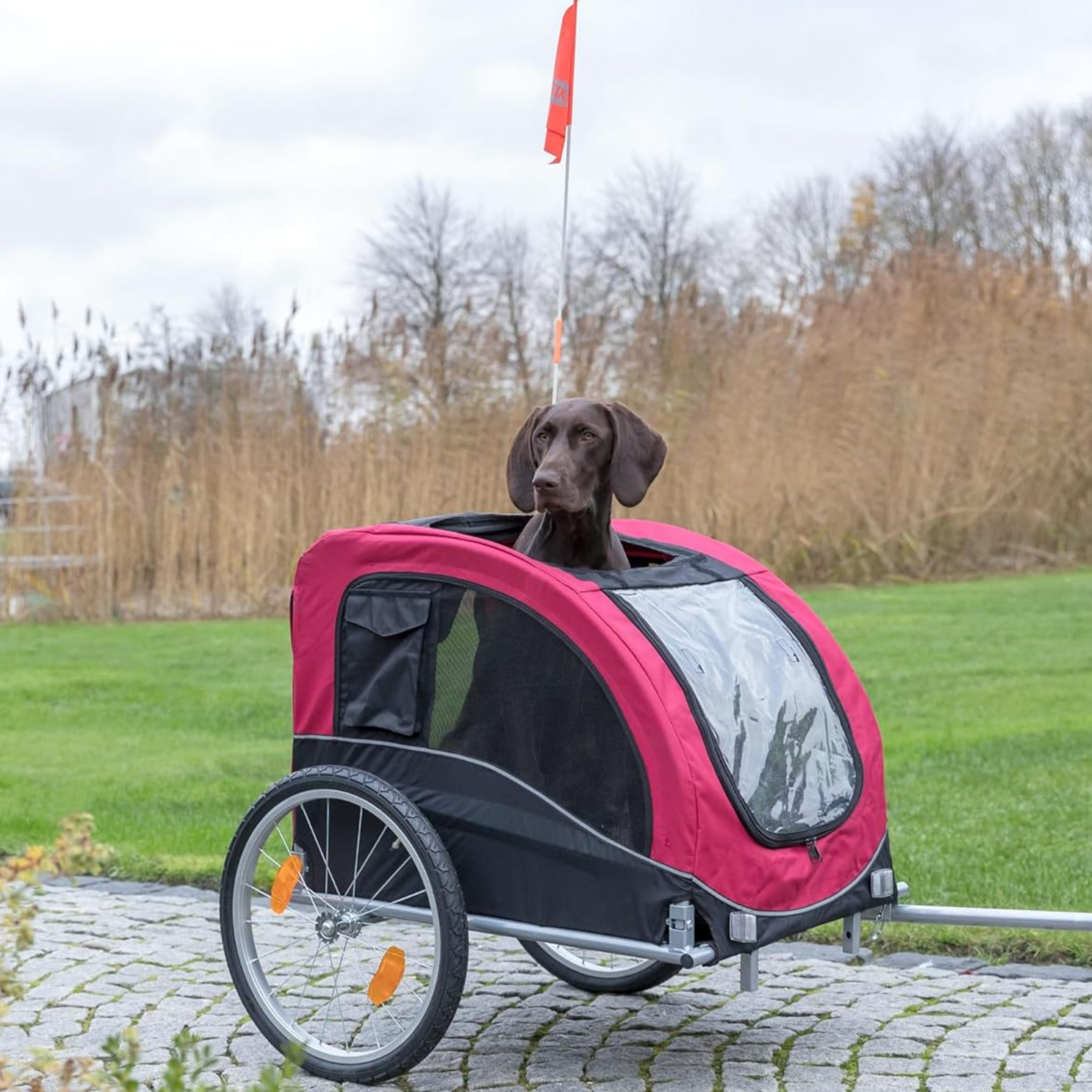 La solution de transport cycliste avec attelage pour chien incluse offre un espace spacieux, sécurisé et bien ventilé à votre animal. Elle est équipée de portes avant et arrière, de filets résistants, d’un toit refermable et de deux poches latérales pour vos accessoires. Le système réfléchissant et le fanion de sécurité garantissent une excellente visibilité. Pliable et facile à monter, elle se fixe rapidement grâce à un système de clips rapides.
