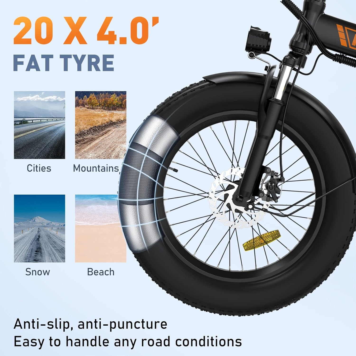 Notre bicylclette électrique est dotée de gros pneus de 20 pouces et d’un levier de vitesses à 7 rapports, lui conférant une polyvalence exceptionnelle sur divers types de terrains. Que vous rouliez en ville, sur des chemins enneigés, des plages ou des sentiers rocheux, il offre une excellente traction et une capacité d’adaptation remarquable. Le système de suspension amélioré et les amortisseurs garantissent un confort optimal même sur de longues distances, tandis que les freins à disque avant et arrière assurent une sécurité maximale grâce à un freinage efficace et réactif.