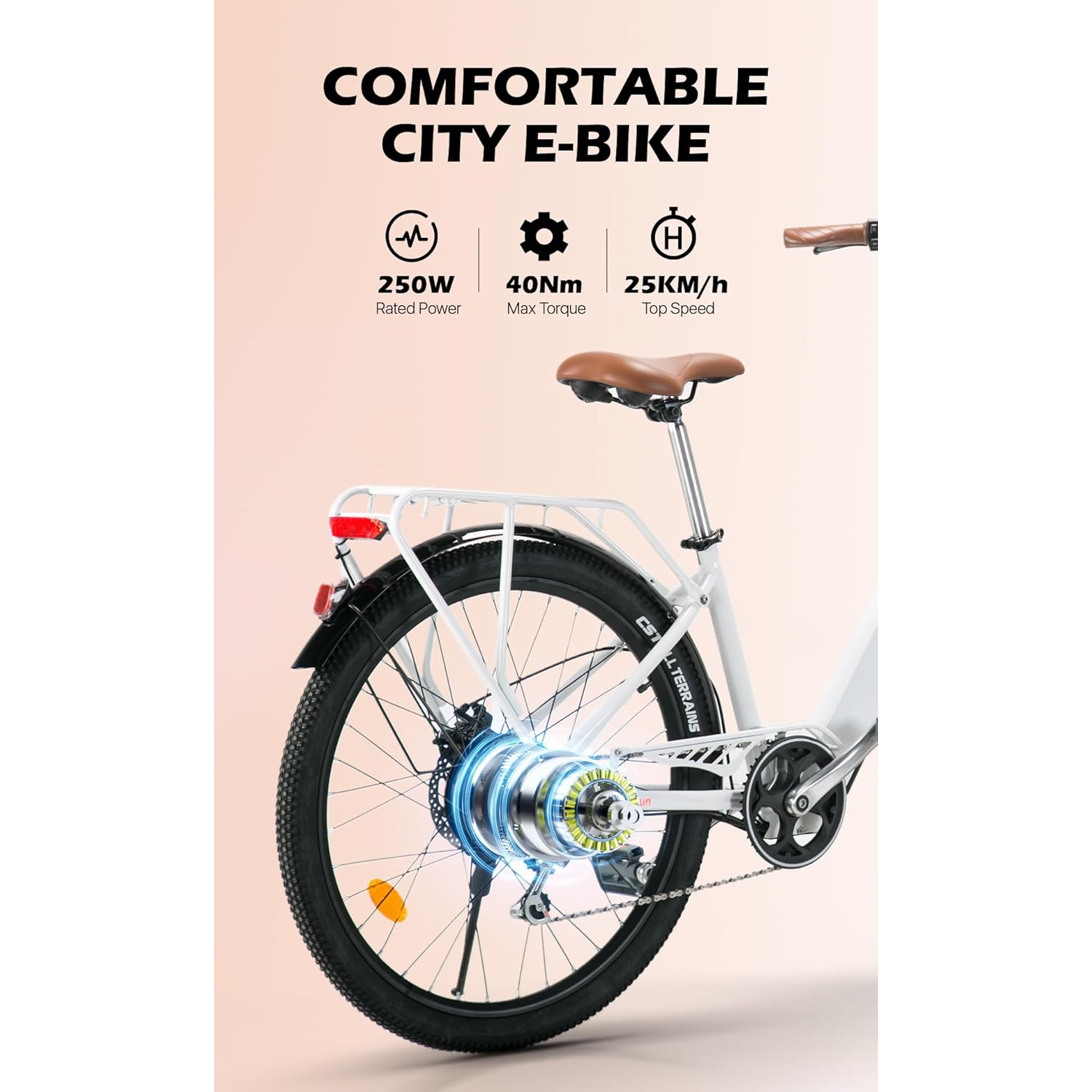 Le vélo à assistance électrique pour citadine intègre un moteur sans balais de 250 W, permettant d’atteindre une vitesse maximale de 25 km/h. Ce système d’entraînement assure une assistance régulière lors du pédalage et réduit la fatigue sur les longues distances. Grâce à la transmission Shimano à 7 vitesses, la gestion de la puissance s’effectue en douceur, offrant une conduite parfaitement adaptée aux terrains urbains et périurbains.