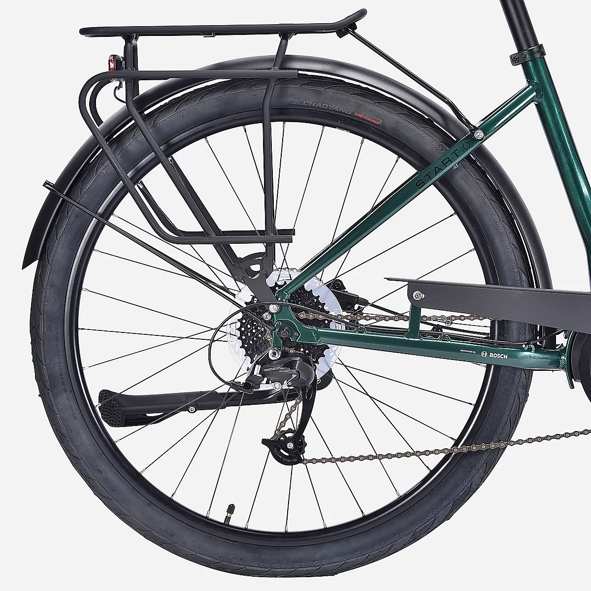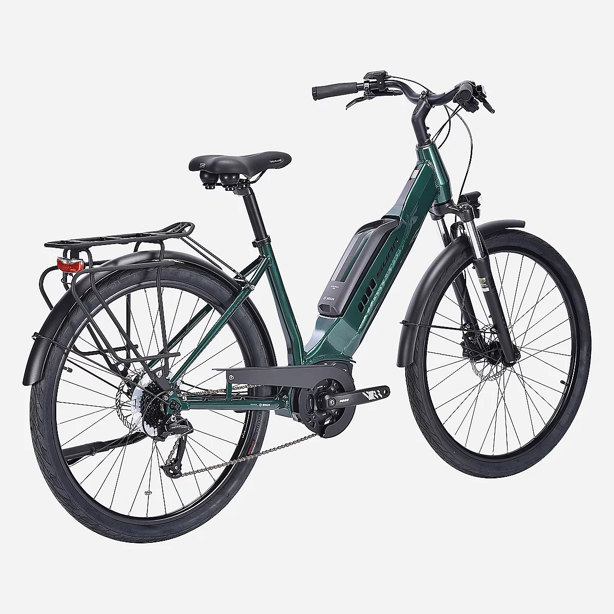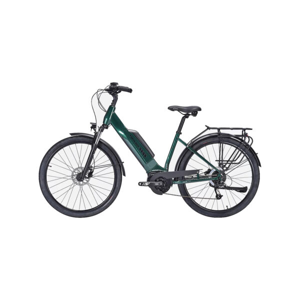 Le modèle à assistance 40 Nm est équipé de freins à disques hydrauliques, garantissant un freinage précis et progressif dans toutes les conditions. L’éclairage fixe intégré à l’avant et à l’arrière améliore la visibilité, tandis que la béquille, les garde-boue et le porte-bagage renforcent la praticité pour un usage quotidien.