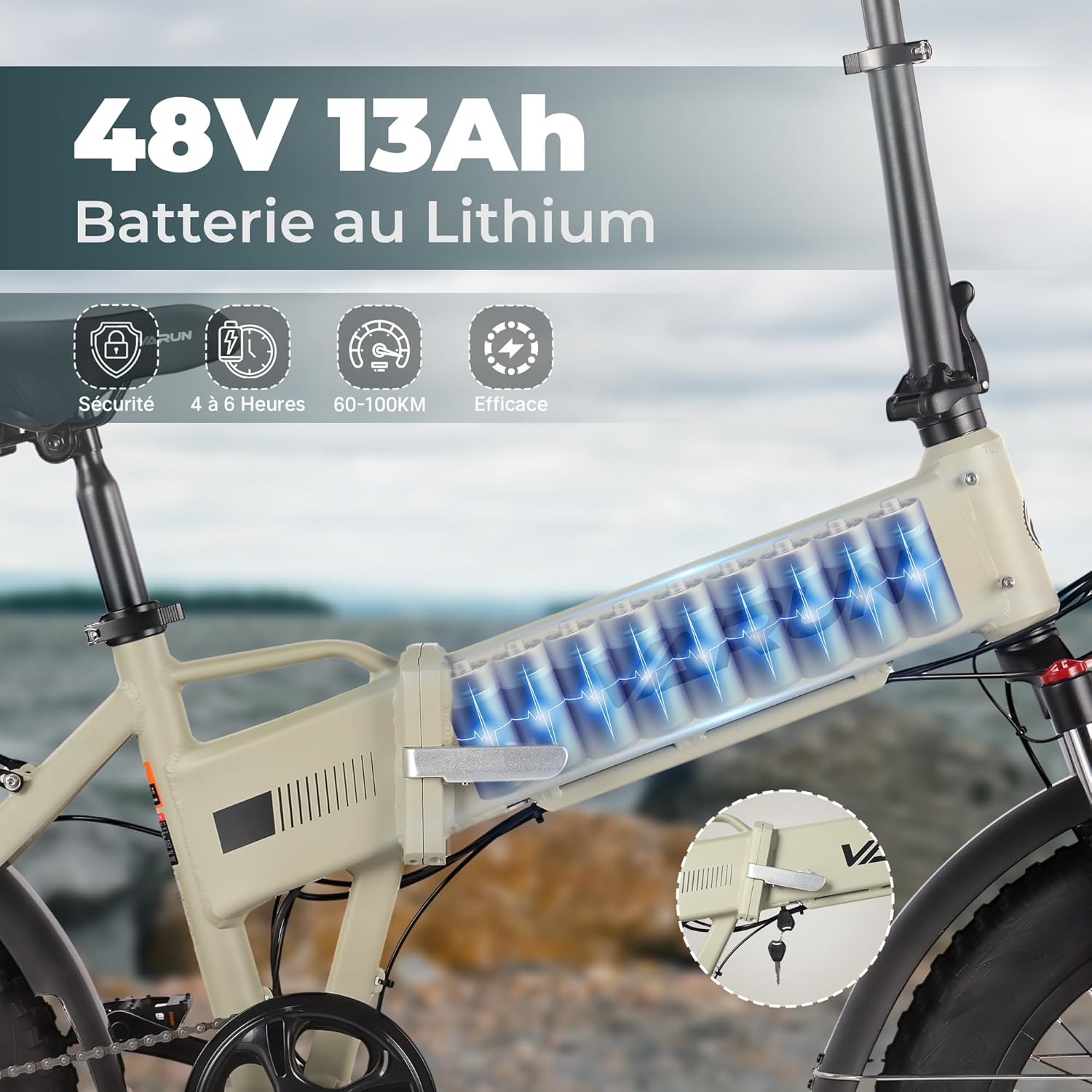 Équipé d’un moteur sans balai de 250W, notre vélo peut atteindre une vitesse maximale de 25 km/h, vous permettant de vous déplacer rapidement en toute simplicité. Sa batterie amovible de 48V 13Ah offre une autonomie pouvant aller jusqu’à 120 km, idéale pour les longs trajets comme pour les déplacements urbains quotidiens.