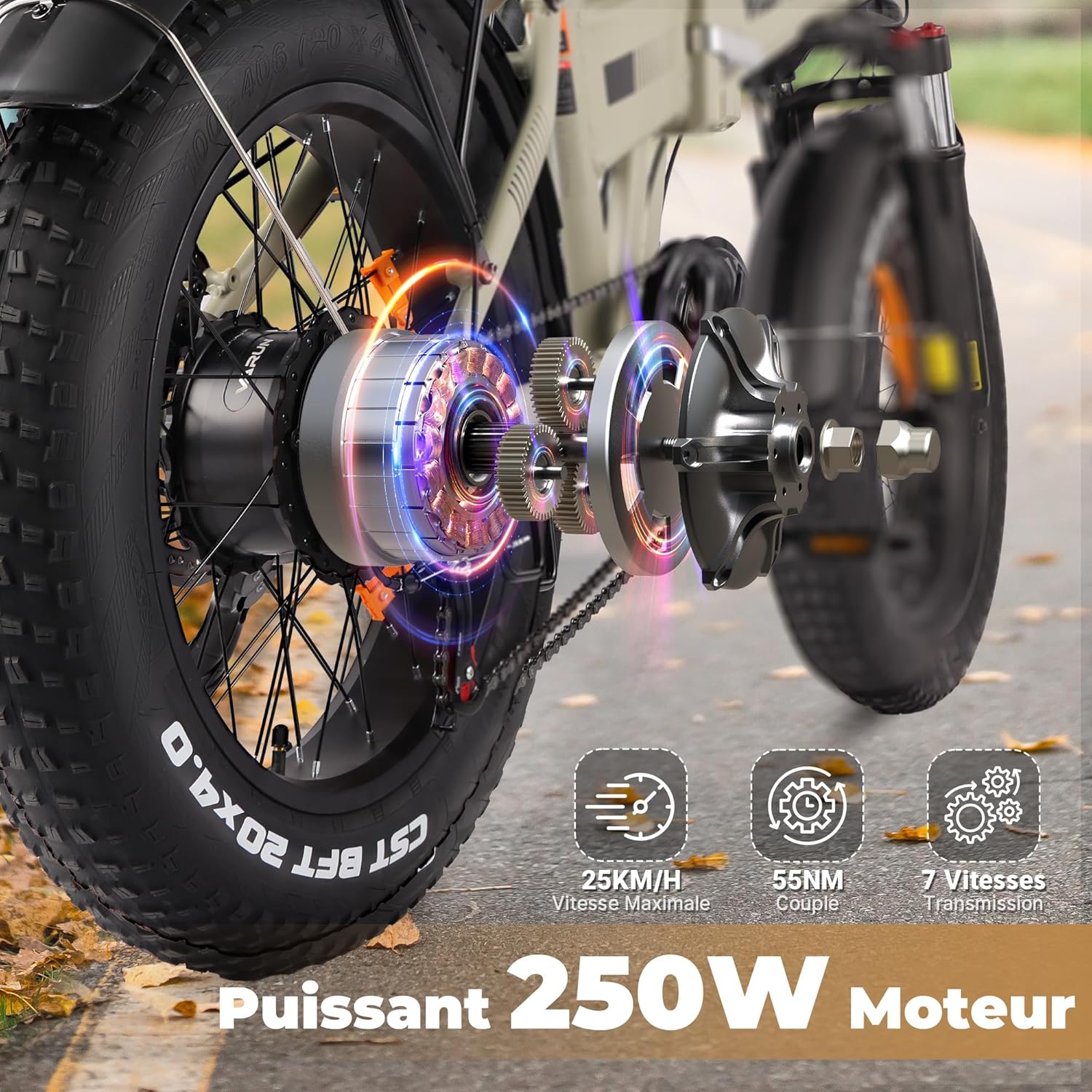 Doté de pneus larges de 20″ x 4.0″, ce vélo offre une excellente adhérence sur différents types de surfaces, qu’il s’agisse de routes urbaines, de sentiers, de plages ou même de chemins enneigés. Vous profitez ainsi d’une conduite stable et sécurisée, quelles que soient les conditions.