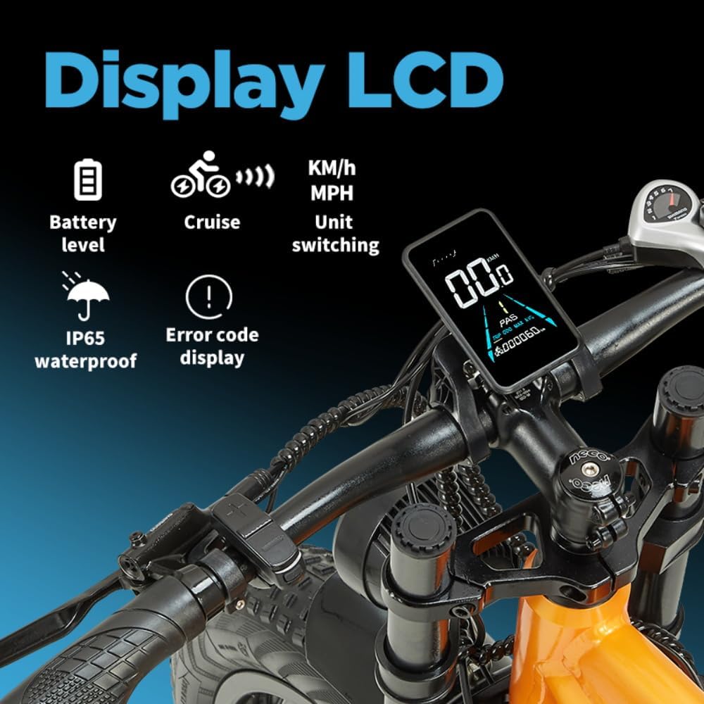 L’écran LCD intégré sur notre vélo à double impulsion électrique vous informe en temps réel de la vitesse, du niveau de batterie, du kilométrage parcouru et du mode de propulsion activé (avant, arrière ou double). Intuitif et clair, il vous aide à mieux gérer vos trajets et à optimiser votre autonomie.
