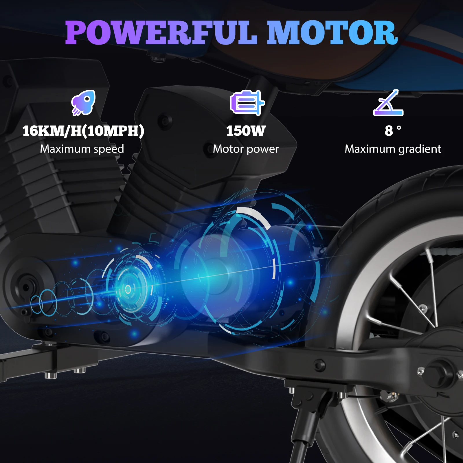 Équipé d’un moteur de 150W, notre vélo permet d’atteindre une vitesse maximale de 16 km/h. Son système à deux modes réglables (8 km/h et 16 km/h) permet aux enfants de progresser en toute confiance, en adaptant la vitesse à leur niveau et à leur aisance.