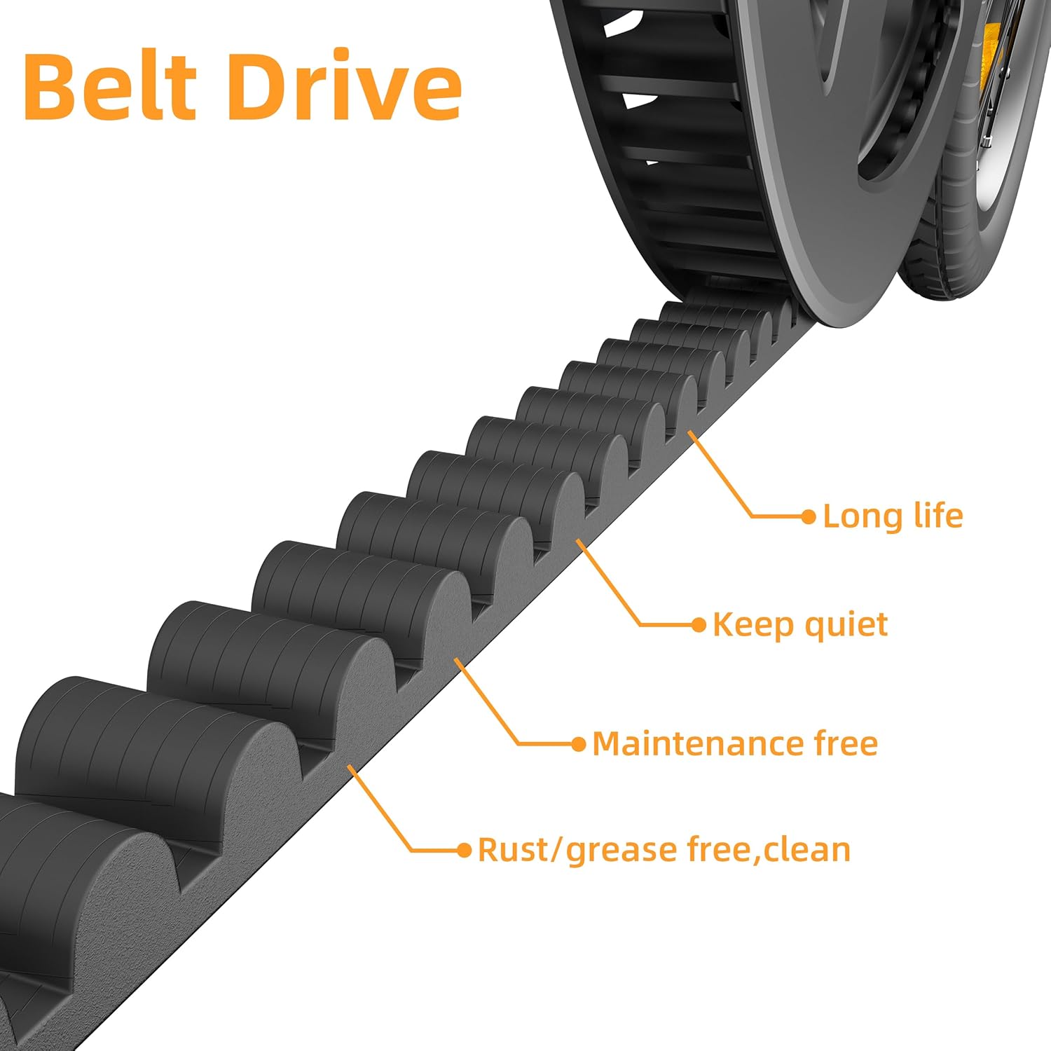 Nous avons opté pour un système d’entraînement par courroie, significativement plus léger que les chaînes traditionnelles, offrant une transmission plus douce et silencieuse. Cette technologie assure une efficacité de transmission allant jusqu’à 98%, réduit les frottements et prolonge la durée de vie du système, nécessitant moins d’entretien. Cette caractéristique contribue à une expérience de conduite agréable et sans effort.