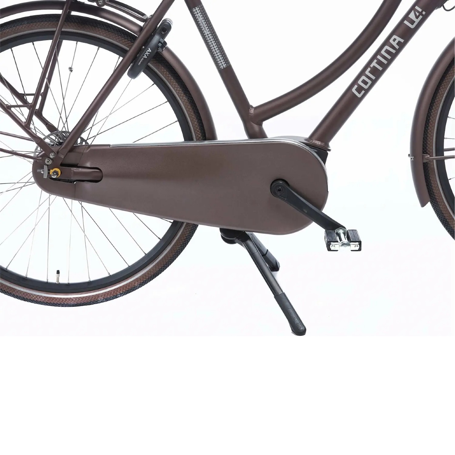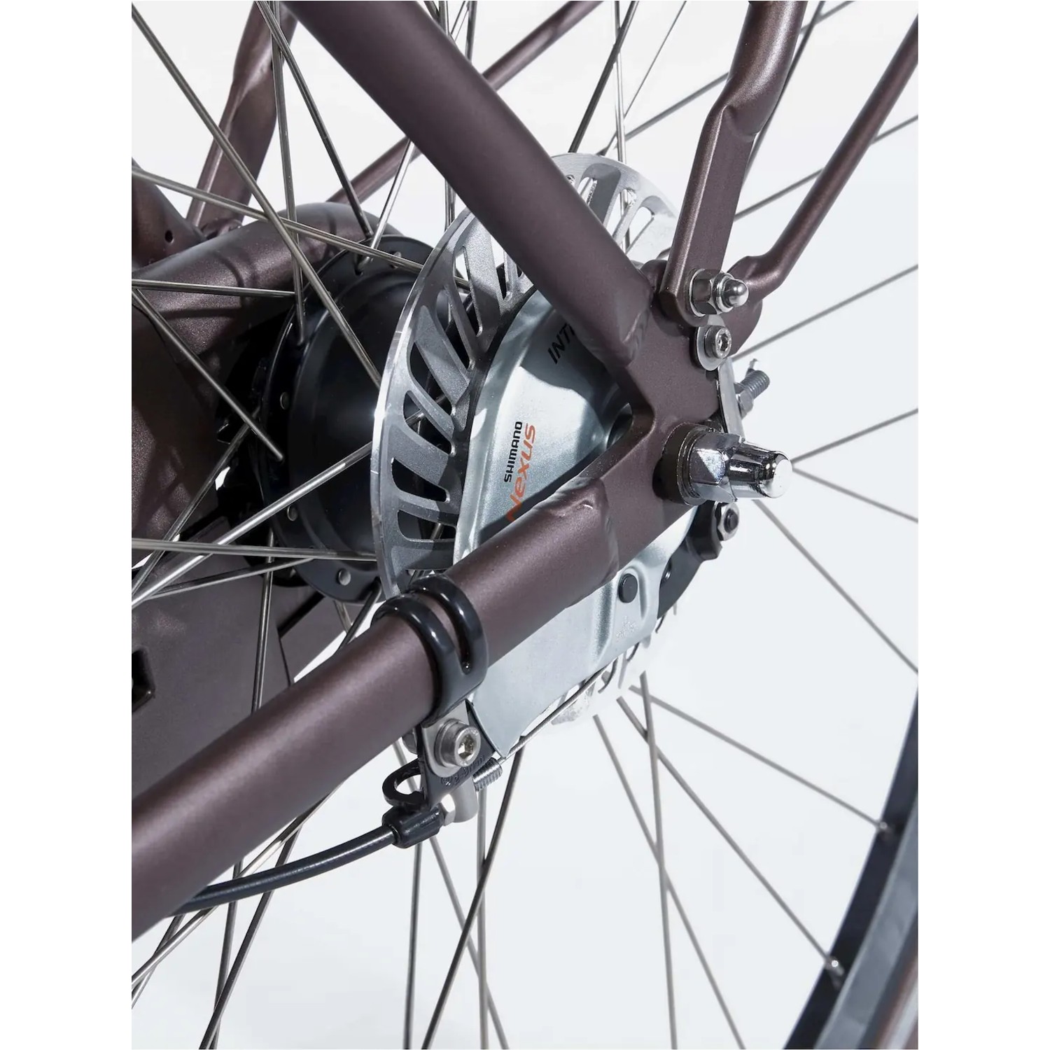 Le modèle électrique dédié aux familles urbaines utilise un moyeu Shimano Nexus à 7 vitesses intégrées combiné à une transmission par chaîne. Ce système assure des changements de vitesses précis et une maintenance réduite. Le couple moteur de 40 Nm offre une assistance douce et suffisante pour les trajets en ville et les routes légèrement vallonnées.