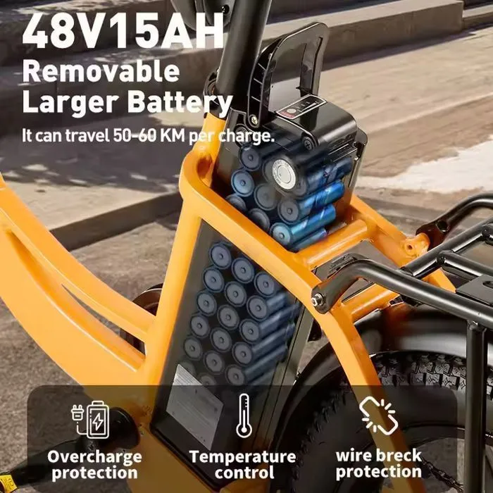Notre vélo électrique tout-chemin à moteur puissant est équipé d’une batterie lithium 48V 15AH amovible, offrant jusqu’à 100 km d’autonomie en mode assistance au pédalage. En mode 100 % électrique, vous pouvez parcourir 50 à 60 km sans effort. Rechargeable en seulement 6 heures, il s’adapte parfaitement aux rythmes de votre quotidien ou de vos week-ends prolongés.