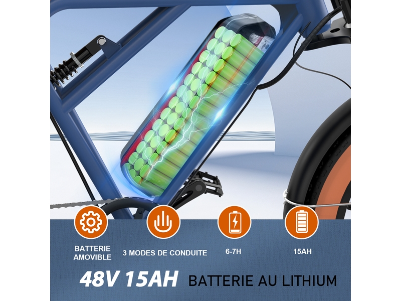 Propulsé par un moteur de 250W, notre vélo électrique vous assiste efficacement jusqu’à une vitesse maximale de 25 km/h, respectant ainsi les régulations en vigueur. La batterie lithium-ion de 48V et 15Ah assure une autonomie impressionnante, pouvant varier de 45 à 100 km selon les conditions de conduite, le poids de l’utilisateur et le terrain. Cette large plage d’autonomie vous offre la liberté de planifier des itinéraires longs sans vous soucier de la recharge fréquente. Le temps de charge complet est d’environ 7 à 8 heures.