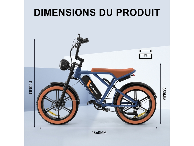 Notre vélo est conçu pour accueillir des utilisateurs à partir de 16 ans. Les dimensions globales du vélo sont de 164 cm de long, 68 cm de large et 115 cm de haut, offrant une ergonomie adaptée à une large gamme de morphologies. Les roues de 20 pouces contribuent à sa maniabilité et sa compacité. Il convient à des personnes recherchant un équilibre entre stabilité et agilité, facilitant les manœuvres en milieu urbain et les franchissements d’obstacles sur sentiers.
