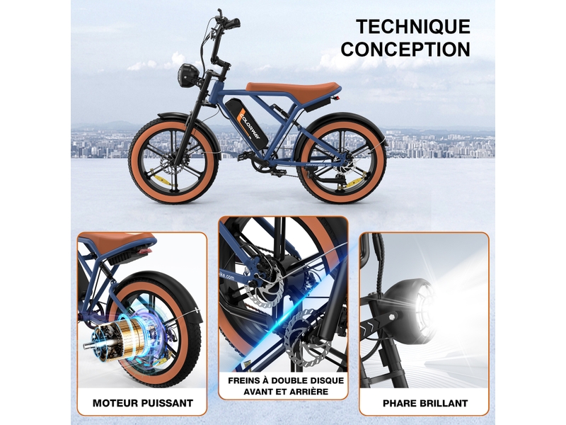 Le cadre de notre Vélo Électrique Frein Moteur est fabriqué en acier au carbone, un matériau reconnu pour sa solidité et sa capacité à absorber les chocs, garantissant une durabilité exceptionnelle. Cette structure robuste supporte une charge maximale de 120 kg, vous permettant de transporter vos affaires en toute sécurité. La conception tout-terrain, avec ses pneus de 20 pouces et sa suspension avant, offre une adhérence remarquable et un confort accru, même sur des surfaces irrégulières. Que ce soit pour des trajets en ville ou des escapades en pleine nature, notre véhicule à deux roues offre une grande polyvalence.
