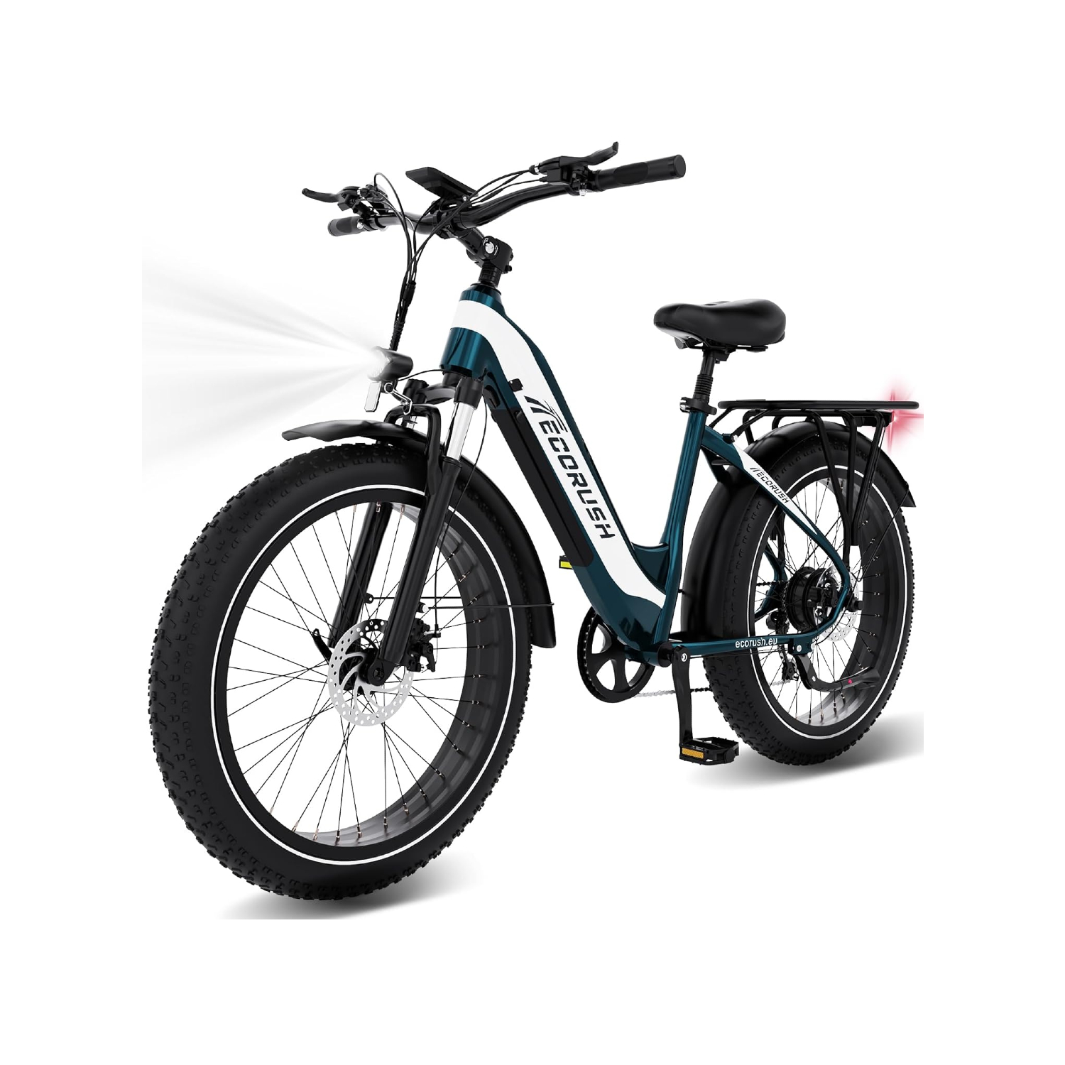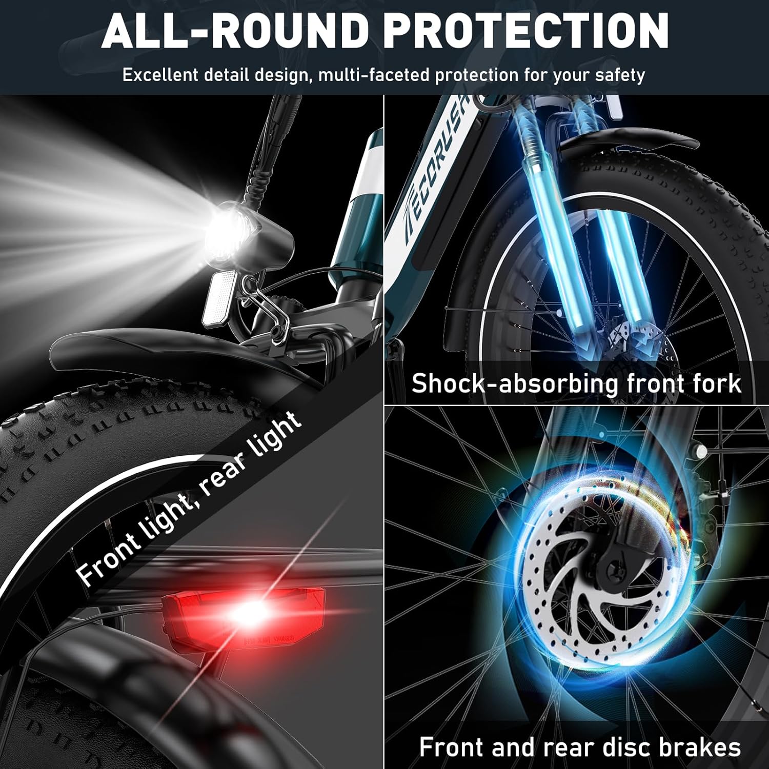 Doté d’un cadre en aluminium robuste, d’une fourche à suspension absorbant les chocs et d’un double frein à disque, ce vélo garantit une expérience de conduite fluide et sécurisée. Les feux LED avant et arrière assurent une visibilité optimale, de jour comme de nuit.