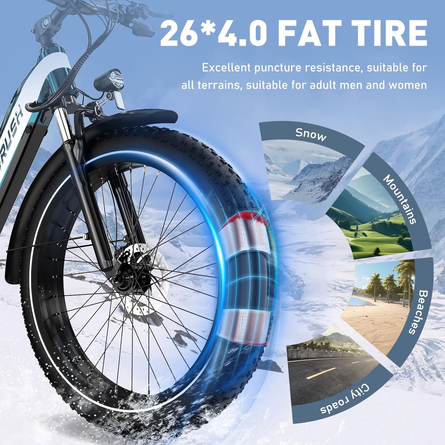 Équipé de pneus 26 x 4.0 pouces, notre vélo électrique offre une stabilité exceptionnelle et une excellente résistance aux crevaisons. Il franchit sans effort les terrains accidentés, que ce soit la plage, la neige ou les chemins rocailleux, pour une expérience de conduite fluide et sécurisée.