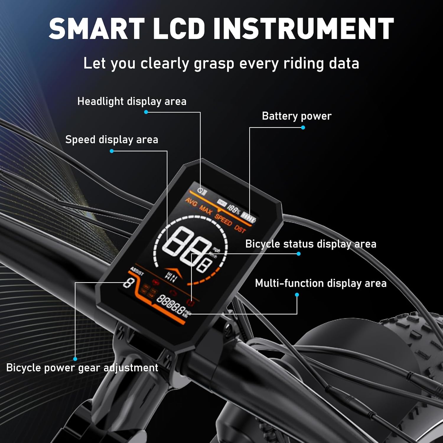 Écran de bord : Affichage numérique indiquant la vitesse, la batterie et le kilométrage