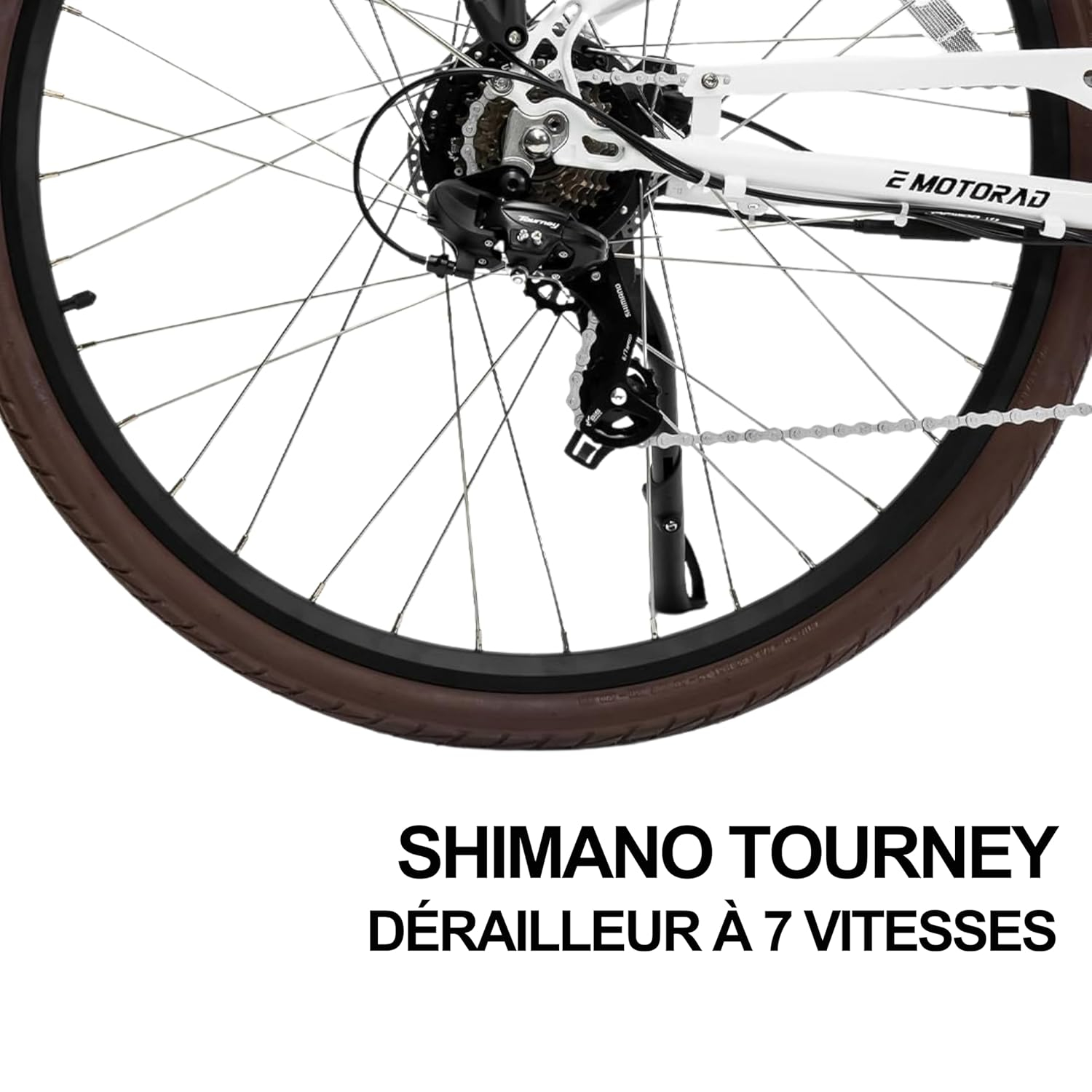 Équipé d’un dérailleur Shimano à 7 vitesses, notre vélo assure des changements de vitesse précis et réactifs. Que vous rouliez en montée ou sur terrain plat, vous trouverez toujours le réglage idéal pour un confort de conduite optimal.