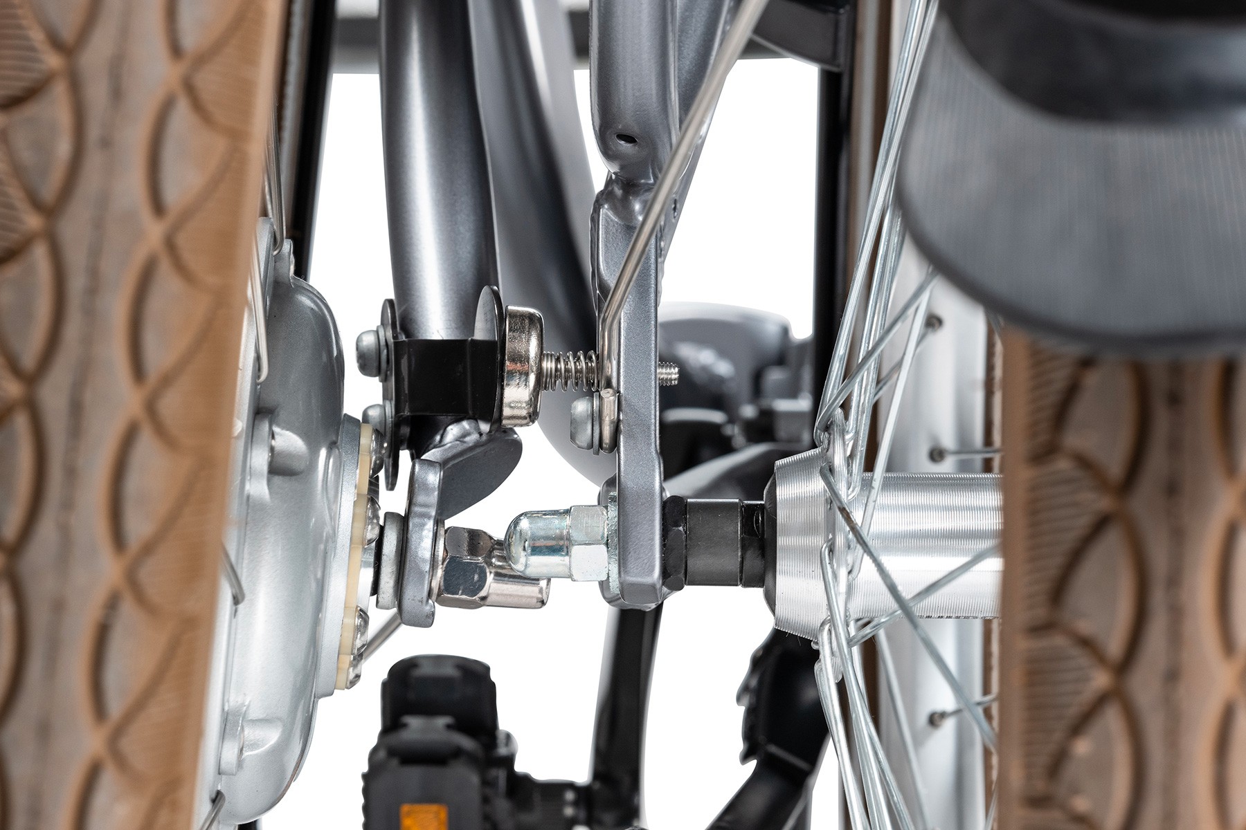 Avec ses pneumatiques 20″ x 1,75″ équipés d’une bande réfléchissante, ce vélo électrique pliable pour la ville renforce la visibilité dans les zones peu éclairées. Les jantes en aluminium à perçage spécifique améliorent la résistance aux chocs, tandis que les moyeux en alliage garantissent une rotation fluide et durable.