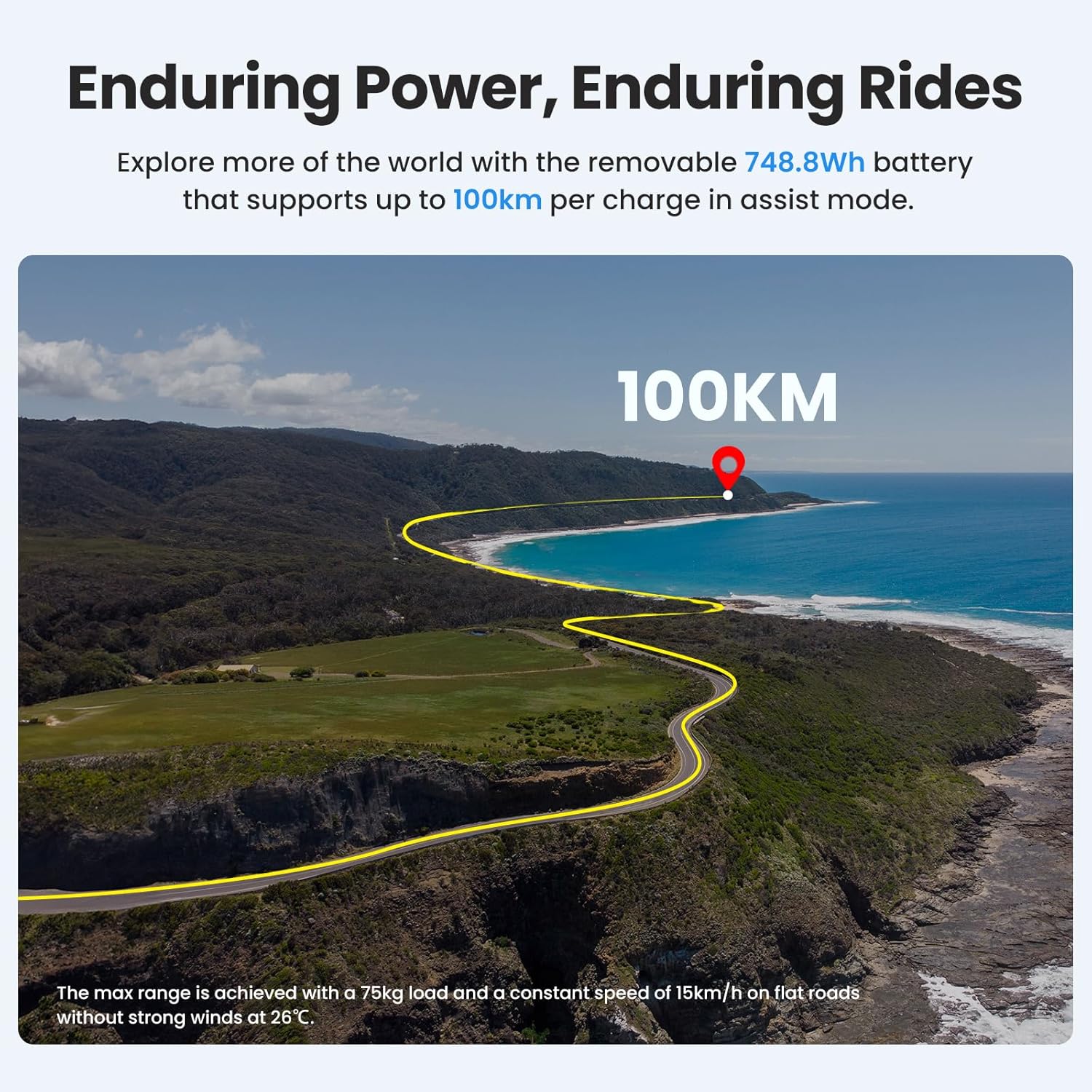 Équipé d’un moteur sans balais délivrant un couple de 60 Nm, ce vélo vous assure une assistance fluide et réactive, idéale pour parcourir de longues distances sans effort. Sa batterie amovible de 48V – 15,6 Ah vous permet d’atteindre jusqu’à 100 km d’autonomie en mode assistance, garantissant une grande liberté de mouvement pour toutes vos aventures.