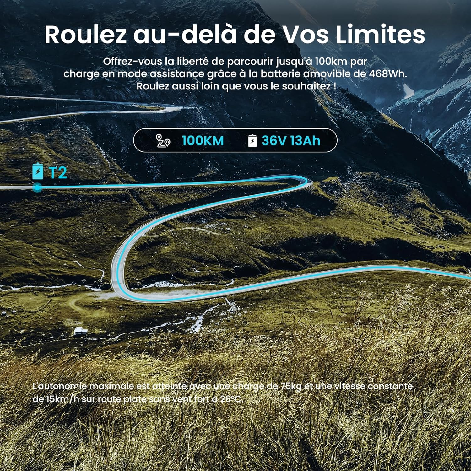 • Autonomie : jusqu’à 100 km en mode assistance (selon poids de l’utilisateur, type de terrain et niveau d’assistance)