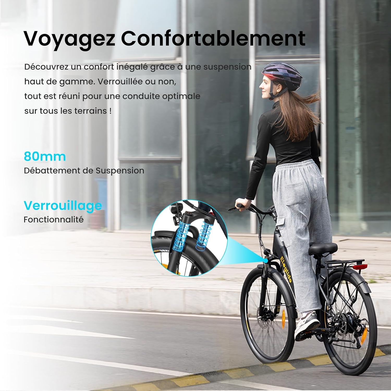 Ce vélo équipé d’un moteur central discret offre un confort optimal grâce à sa fourche suspendue verrouillable, sa selle réglable et son guidon ergonomique. Vous adaptez facilement votre posture pour des trajets sans douleur, même sur longues distances. Sa capacité à absorber les chocs et son cadre en aluminium léger assurent une conduite souple et sans fatigue.
