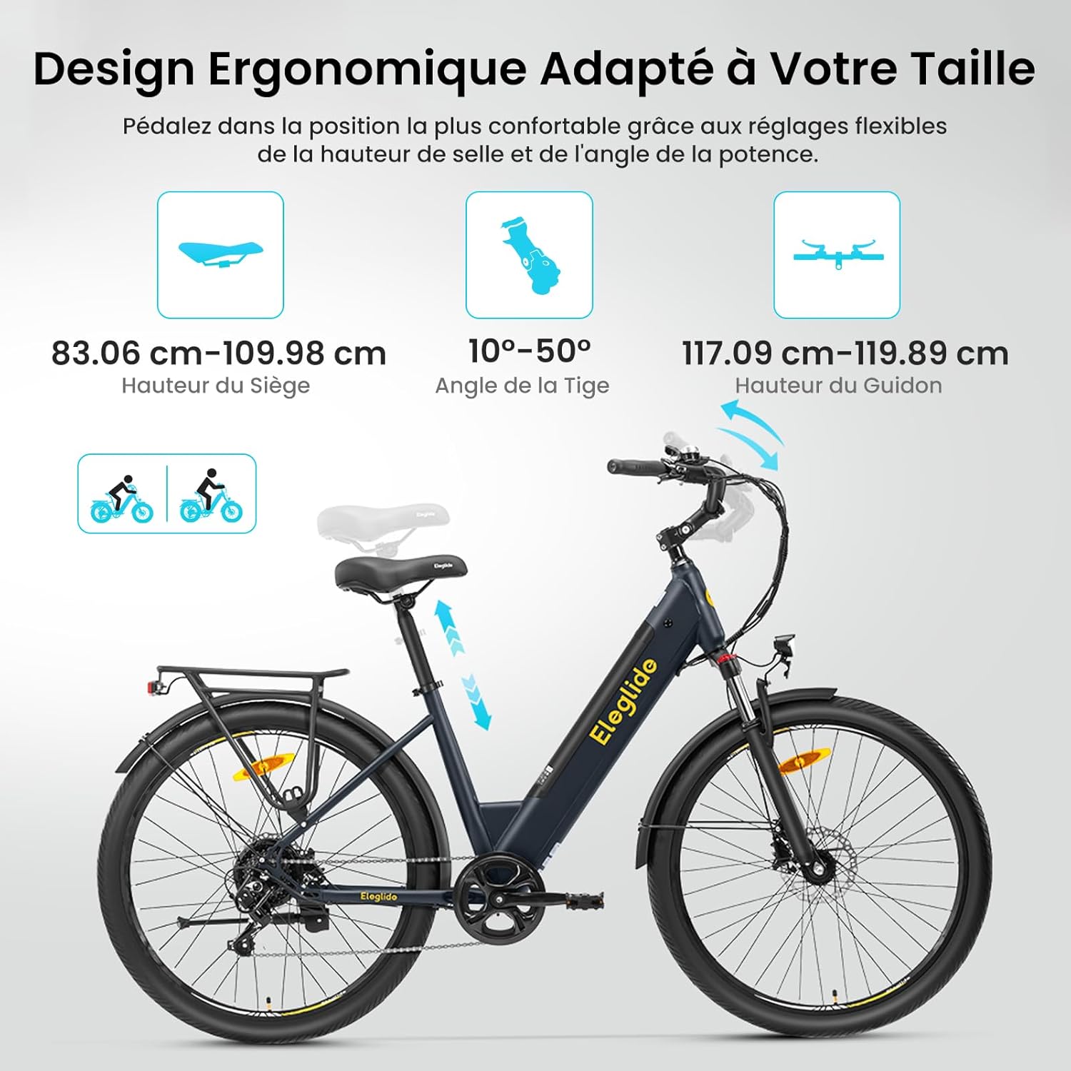 Ce modèle propose un cadre à géométrie universelle, parfaitement adapté aux personnes mesurant entre 1m65 et 1m90. Grâce à sa potence et sa selle réglables, notre vélo avec assistance au pédalage par moteur central convient à différents gabarits, pour une posture naturelle et un confort optimal, quel que soit votre usage.