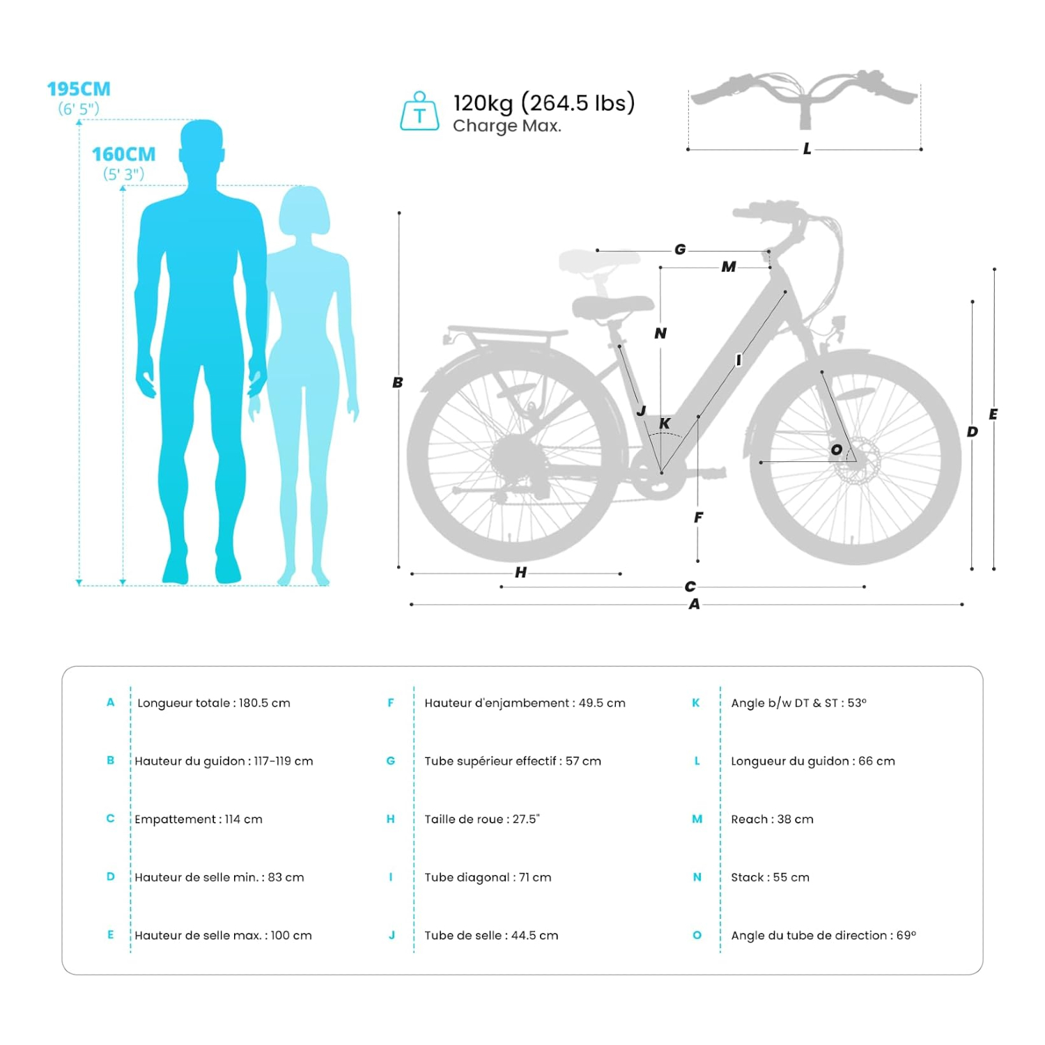 Taille cadre et / ou vélo / taille de l’utilisateur recommandée : Cadre universel adapté aux utilisateurs entre 1m65 et 1m90